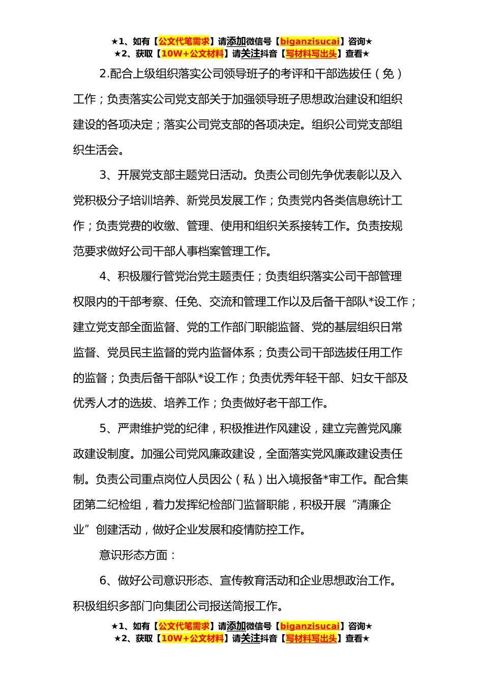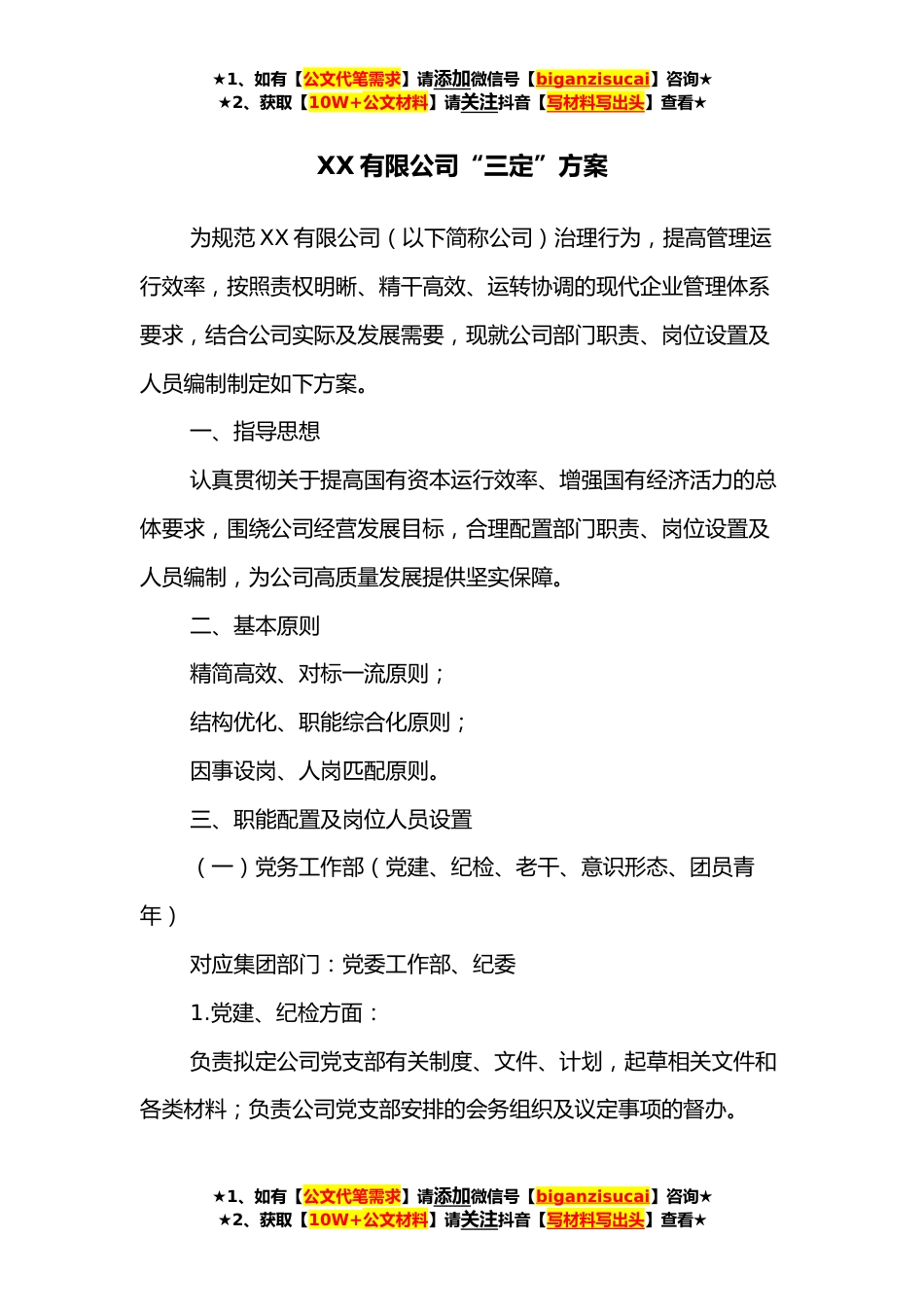 ★1、如有【公文代笔需求】请添加微信号【biganzisucai】咨询★★2、获取【10W+公文材料】请关注抖音【写材料写出头】查看★XX有限公司“三定”方案为规范XX有限公司(以下简称公司)治理行为,提高管理运行效率,按照责权明晰、精干高效、运转协调的现代企业管理体系要求,结合公司实际及发展需要,现就公司部门职责、岗位设置及人员编制制定如下方案。一、指导思想认真贯彻关于提高国有资本运行效率、增强国有经济活力的总体要求,围绕公司经营发展目标,合理配置部门职责、岗位设置及人员编制,为公司高质量发展提供坚实保障。二、基本原则精简高效、对标一流原则;结构优化、职能综合化原则;因事设岗、人岗匹配原则。三、职能配置及岗位人员设置(一)党务工作部(党建、纪检、老干、意识形态、团员青年)对...