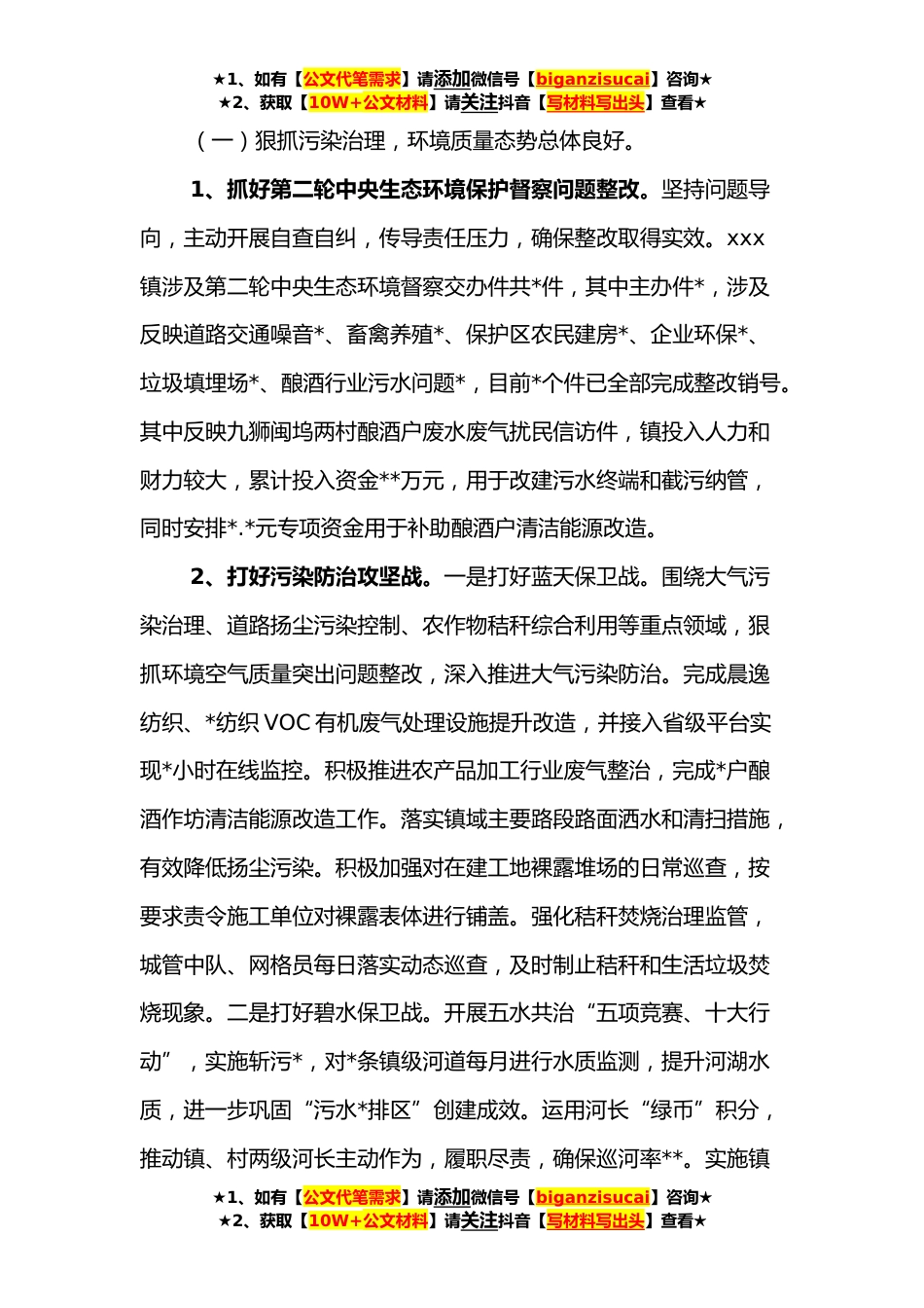 ★1、如有【公文代笔需求】请添加微信号【biganzisucai】咨询★★2、获取【10W+公文材料】请关注抖音【写材料写出头】查看★xxx镇**生态文明建设和环境保护工作报告各位代表、同志们:**,xxx镇生态文明建设和环境保护工作在镇党委政府的正确领导下,坚持以习近平生态文明思想为指导,深入贯彻落实习近平总书记*考察重要讲话精神。坚持“绿水*就是*银山”发展理念,认真落实中央和省市区关于生态文明建设和环境保护工作决策部署。以打造“美丽xxx、幸福宜居镇”为目标,以第二轮中央生态环境保护督察为契机,坚定不移推进绿色转型发展,坚定不移抓好环保督察问题整改,坚定不移打好污染防治攻坚战,持续提高生态环境保护工作水平,推进生态文明建设再上新台阶。下面我代表xxx镇人民政府将**生态文明建设和环境保护...