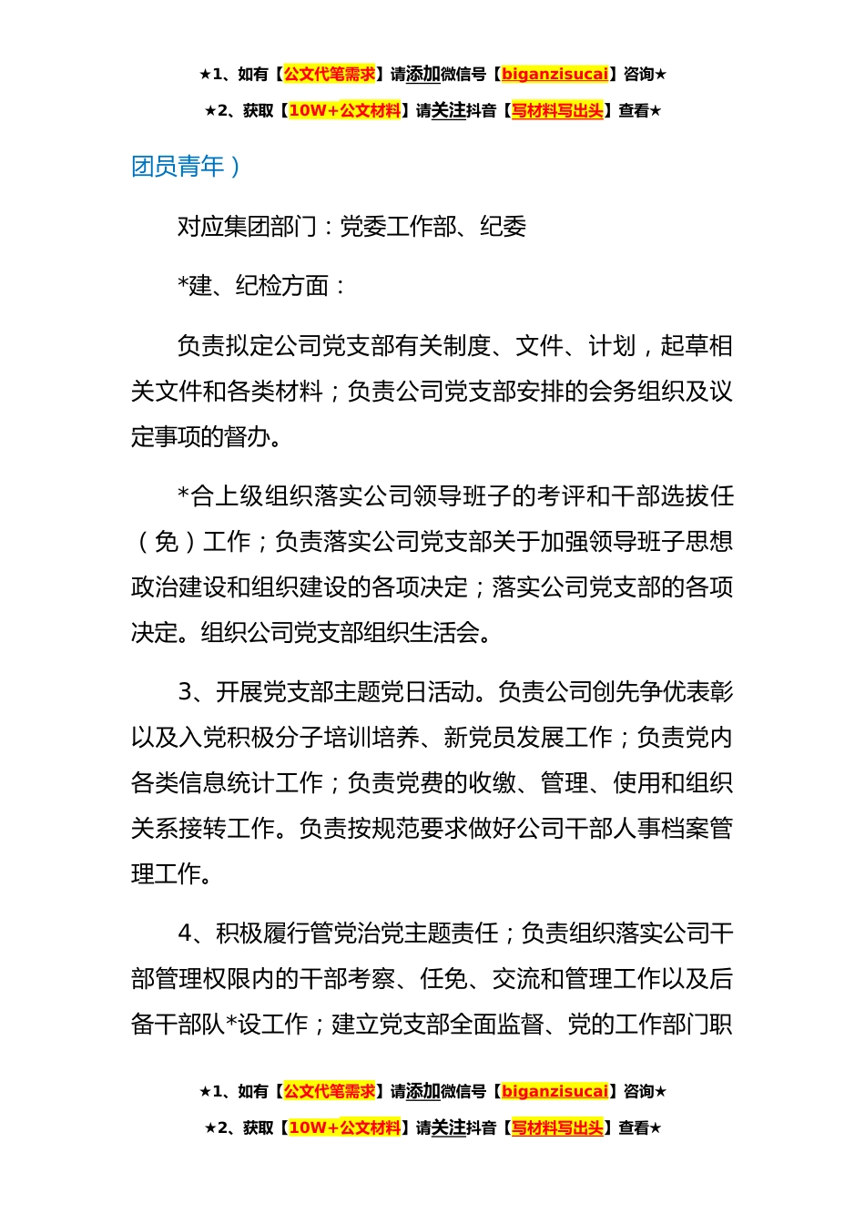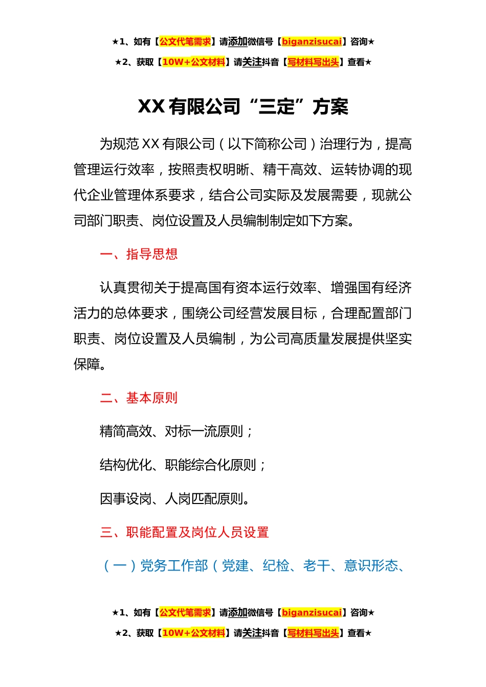 ★1、如有【公文代笔需求】请添加微信号【biganzisucai】咨询★★2、获取【10W+公文材料】请关注抖音【写材料写出头】查看★XX有限公司“三定”方案为规范XX有限公司(以下简称公司)治理行为,提高管理运行效率,按照责权明晰、精干高效、运转协调的现代企业管理体系要求,结合公司实际及发展需要,现就公司部门职责、岗位设置及人员编制制定如下方案。一、指导思想认真贯彻关于提高国有资本运行效率、增强国有经济活力的总体要求,围绕公司经营发展目标,合理配置部门职责、岗位设置及人员编制,为公司高质量发展提供坚实保障。二、基本原则精简高效、对标一流原则;结构优化、职能综合化原则;因事设岗、人岗匹配原则。三、职能配置及岗位人员设置(一)党务工作部(党建、纪检、老干、意识形态、★1、如有【公...