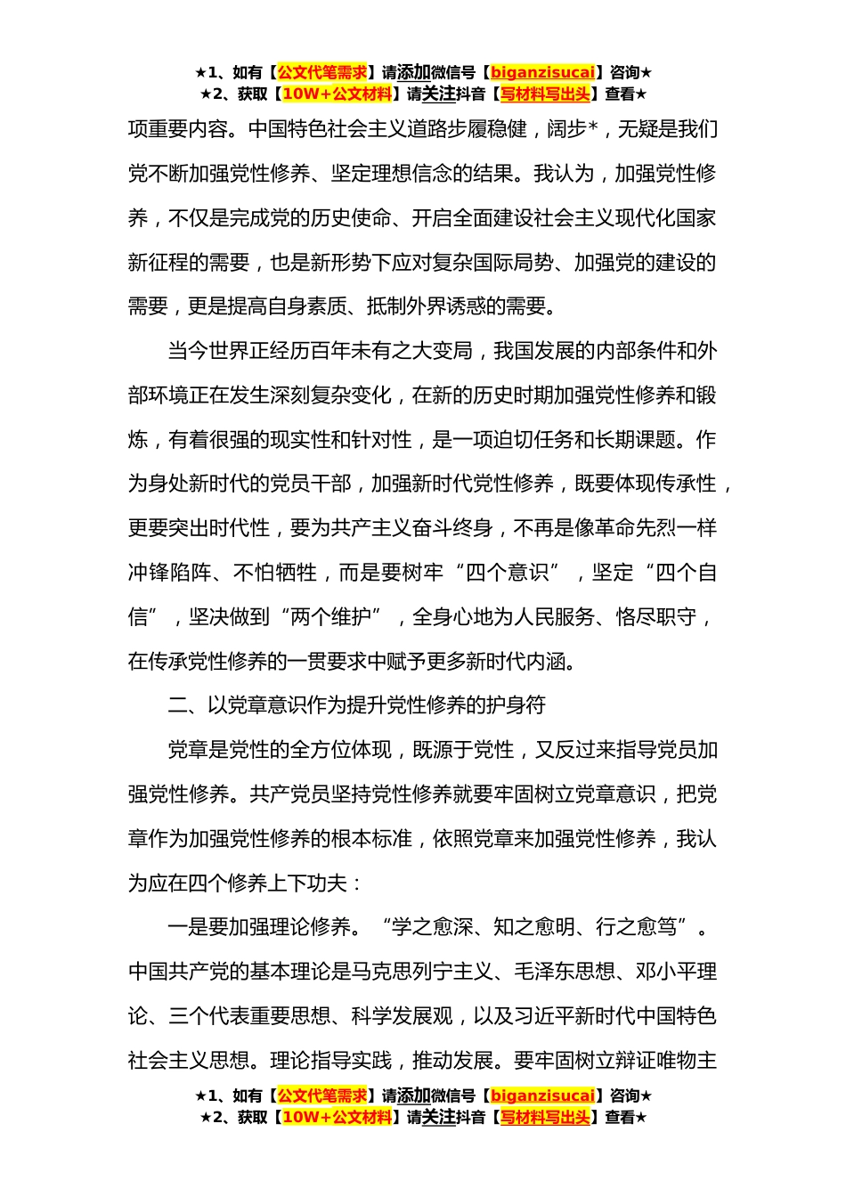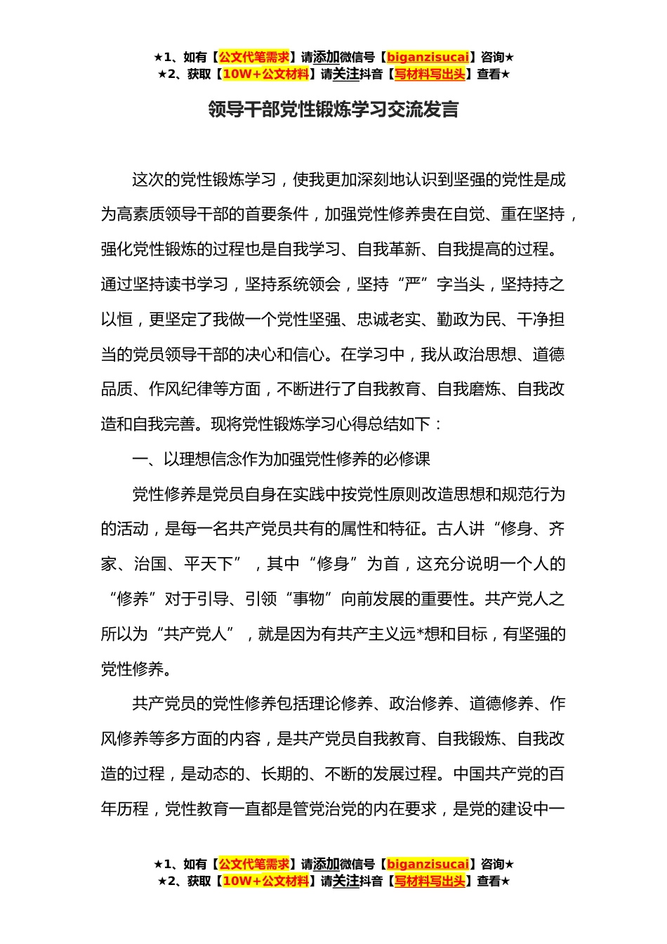 ★1、如有【公文代笔需求】请添加微信号【biganzisucai】咨询★★2、获取【10W+公文材料】请关注抖音【写材料写出头】查看★领导干部党性锻炼学习交流发言这次的党性锻炼学习,使我更加深刻地认识到坚强的党性是成为高素质领导干部的首要条件,加强党性修养贵在自觉、重在坚持,强化党性锻炼的过程也是自我学习、自我革新、自我提高的过程。通过坚持读书学习,坚持系统领会,坚持“严”字当头,坚持持之以恒,更坚定了我做一个党性坚强、忠诚老实、勤政为民、干净担当的党员领导干部的决心和信心。在学习中,我从政治思想、道德品质、作风纪律等方面,不断进行了自我教育、自我磨炼、自我改造和自我完善。现将党性锻炼学习心得总结如下:一、以理想信念作为加强党性修养的必修课党性修养是党员自身在实践中按党性...