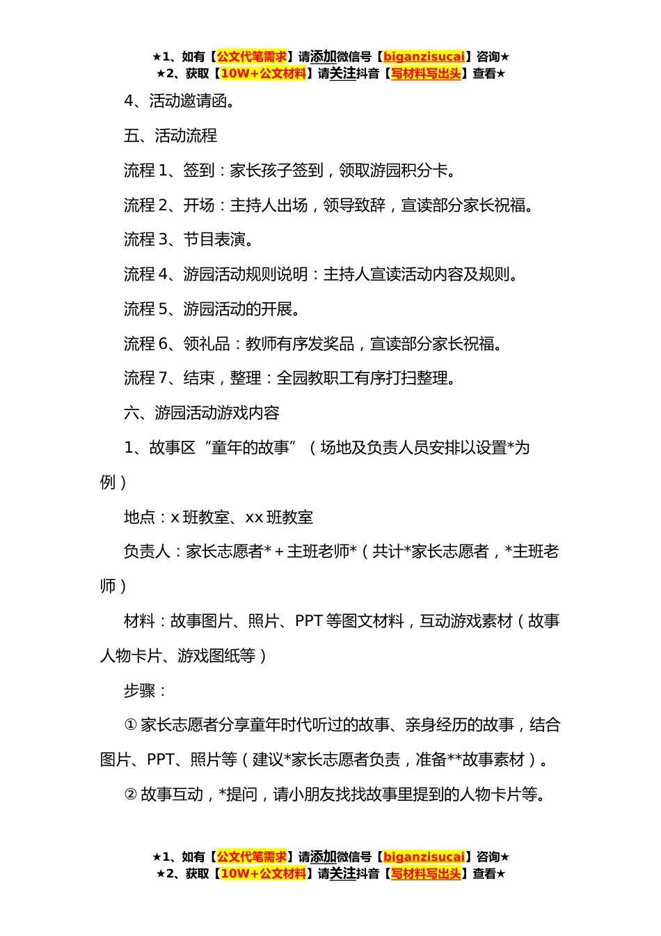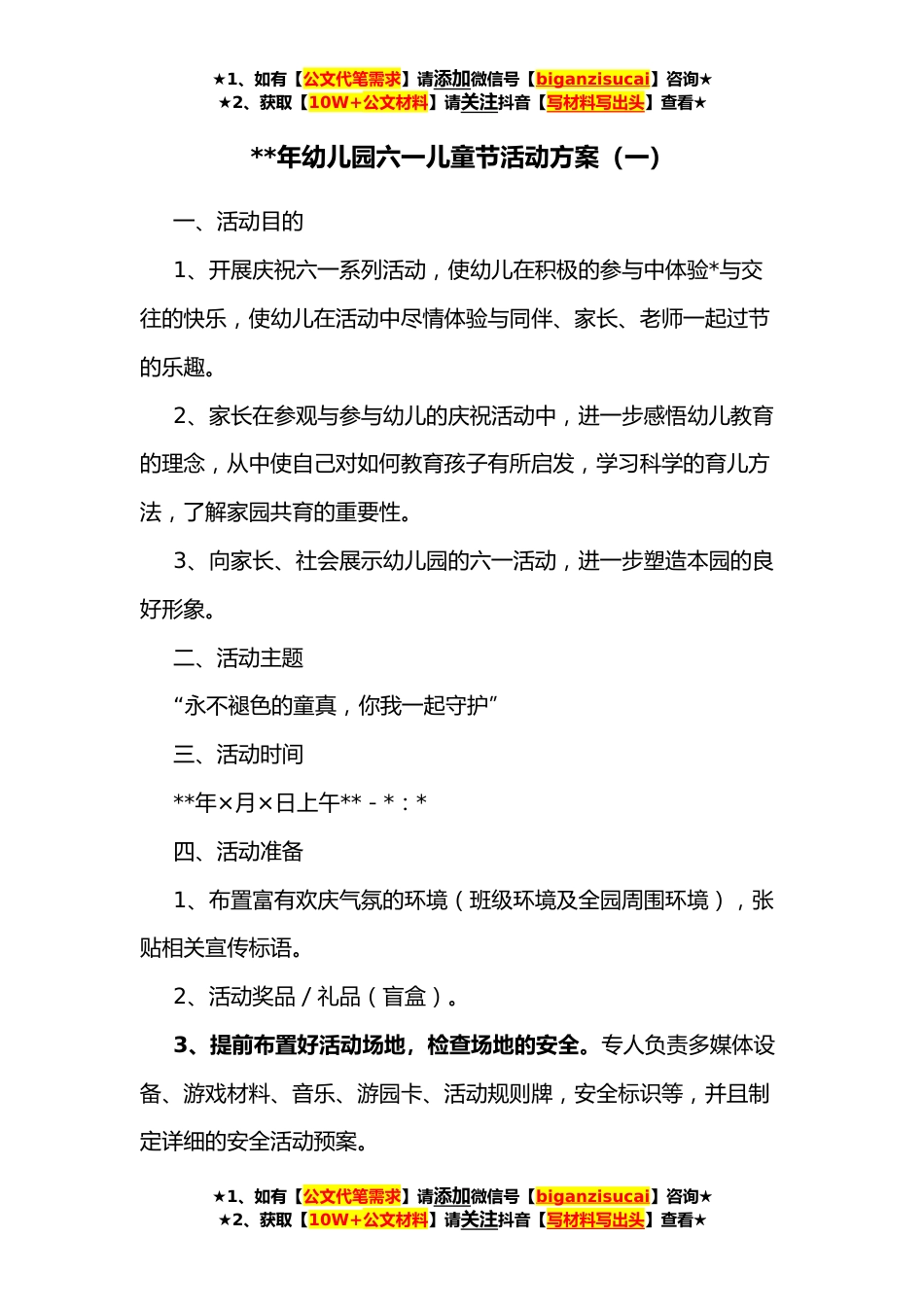 ★1、如有【公文代笔需求】请添加微信号【biganzisucai】咨询★★2、获取【10W+公文材料】请关注抖音【写材料写出头】查看★**年幼儿园六一儿童节活动方案(一)一、活动目的1、开展庆祝六一系列活动,使幼儿在积极的参与中体验*与交往的快乐,使幼儿在活动中尽情体验与同伴、家长、老师一起过节的乐趣。2、家长在参观与参与幼儿的庆祝活动中,进一步感悟幼儿教育的理念,从中使自己对如何教育孩子有所启发,学习科学的育儿方法,了解家园共育的重要性。3、向家长、社会展示幼儿园的六一活动,进一步塑造本园的良好形象。二、活动主题“永不褪色的童真,你我一起守护”三、活动时间**年×月×日上午**-*:*四、活动准备1、布置富有欢庆气氛的环境(班级环境及全园周围环境),张贴相关宣传标语。2、活动奖品/礼...
