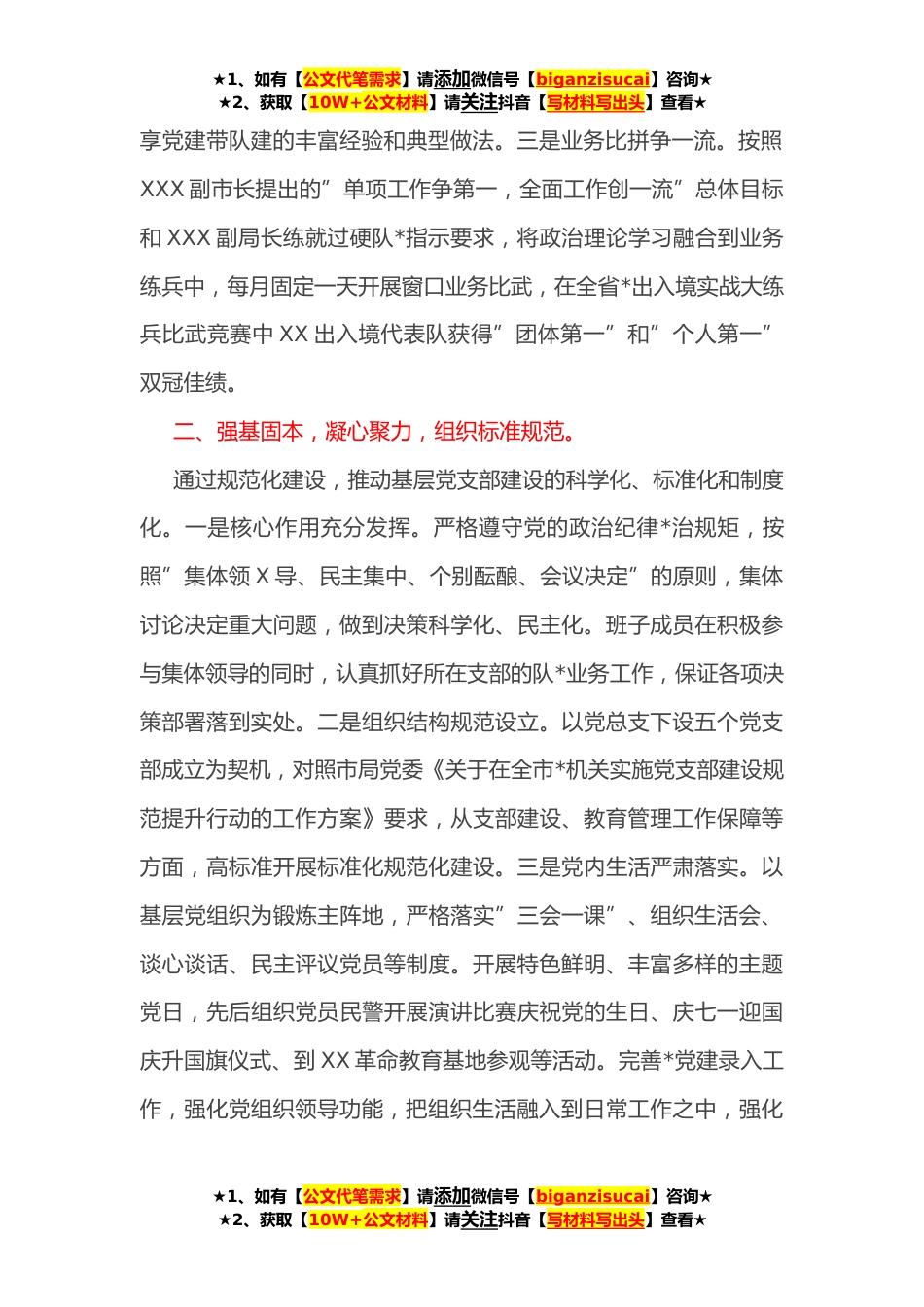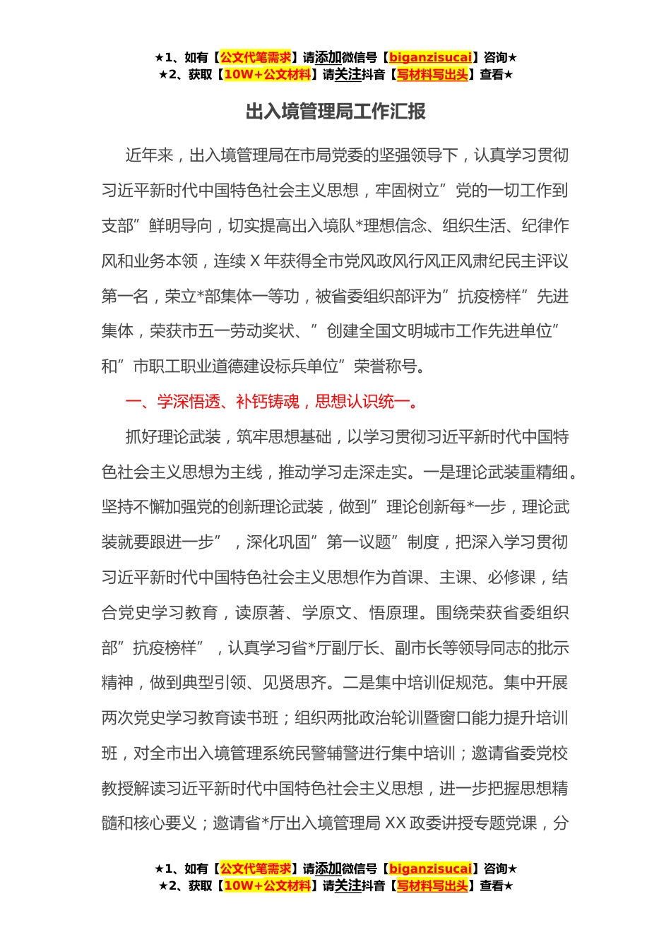 ★1、如有【公文代笔需求】请添加微信号【biganzisucai】咨询★★2、获取【10W+公文材料】请关注抖音【写材料写出头】查看★出入境管理局工作汇报近年来,出入境管理局在市局党委的坚强领导下,认真学习贯彻习近平新时代中国特色社会主义思想,牢固树立”党的一切工作到支部”鲜明导向,切实提高出入境队*理想信念、组织生活、纪律作风和业务本领,连续X年获得全市党风政风行风正风肃纪民主评议第一名,荣立*部集体一等功,被省委组织部评为”抗疫榜样”先进集体,荣获市五一劳动奖状、”创建全国文明城市工作先进单位”和”市职工职业道德建设标兵单位”荣誉称号。一、学深悟透、补钙铸魂,思想认识统一。抓好理论武装,筑牢思想基础,以学习贯彻习近平新时代中国特色社会主义思想为主线,推动学习走深走实。一是...