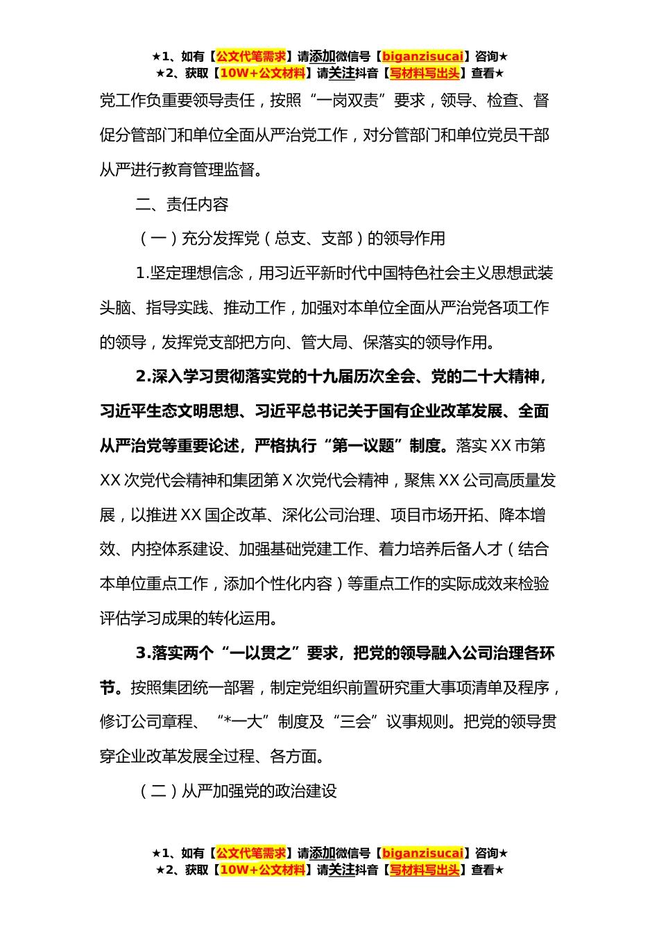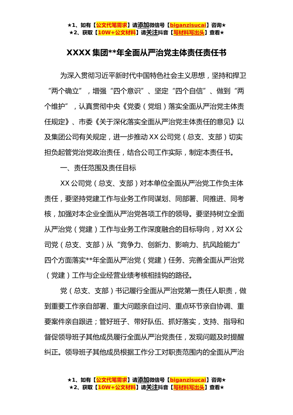 ★1、如有【公文代笔需求】请添加微信号【biganzisucai】咨询★★2、获取【10W+公文材料】请关注抖音【写材料写出头】查看★XXXX集团**年全面从严治党主体责任责任书为深入贯彻习近平新时代中国特色社会主义思想,坚持和捍卫“两个确立”,增强“四个意识”、坚定“四个自信”、做到“两个维护”,认真贯彻中央《党委(党组)落实全面从严治党主体责任规定》、市委《关于深化落实全面从严治党主体责任的意见》以及集团公司有关规定,进一步推动XX公司党(总支、支部)切实担负起管党治党政治责任,结合公司工作实际,制定本责任书。一、责任范围及责任目标XX公司党(总支、支部)对本单位全面从严治党工作负主体责任,要坚持党建工作与业务工作同谋划、同部署、同推进、同考核,加强对本企业全面从严治党各项工作...