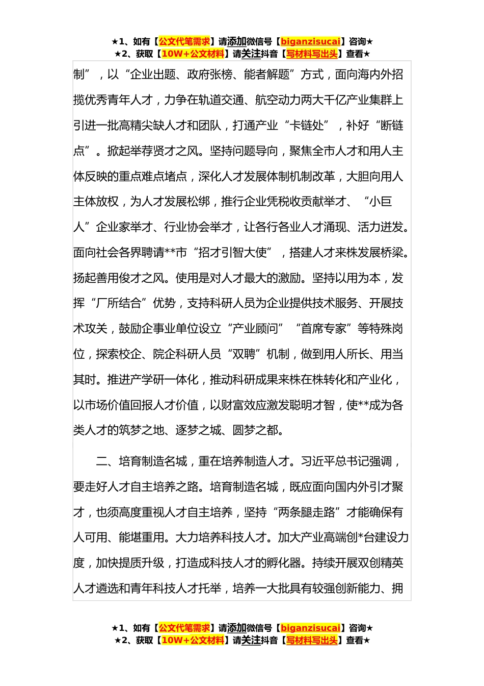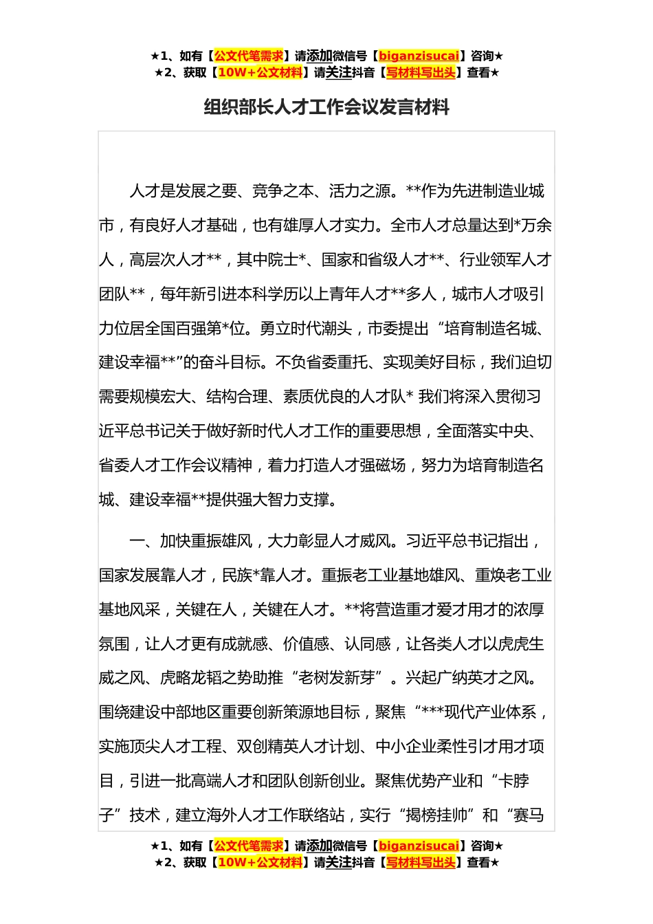 ★1、如有【公文代笔需求】请添加微信号【biganzisucai】咨询★★2、获取【10W+公文材料】请关注抖音【写材料写出头】查看★组织部长人才工作会议发言材料人才是发展之要、竞争之本、活力之源。**作为先进制造业城市,有良好人才基础,也有雄厚人才实力。全市人才总量达到*万余人,高层次人才**,其中院士*、国家和省级人才**、行业领军人才团队**,每年新引进本科学历以上青年人才**多人,城市人才吸引力位居全国百强第*位。勇立时代潮头,市委提出“培育制造名城、建设幸福**”的奋斗目标。不负省委重托、实现美好目标,我们迫切需要规模宏大、结构合理、素质优良的人才队*我们将深入贯彻习近平总书记关于做好新时代人才工作的重要思想,全面落实中央、省委人才工作会议精神,着力打造人才强磁场,努力为培育制...