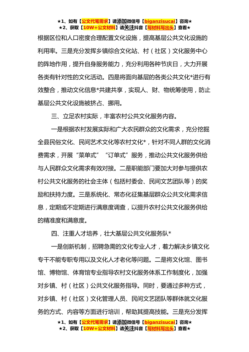 ★1、如有【公文代笔需求】请添加微信号【biganzisucai】咨询★★2、获取【10W+公文材料】请关注抖音【写材料写出头】查看★关于加强农村基本公共文化服务体系建设的建议乡村文化*是乡村*战略的源头活水,是乡村*的铸魂工程。乡村公共文化体系建设则是实施乡村文化*战略的基础和前提,完善的体系可以从文化和精神层面提供支持,提高人们的思想文化素质和科学技术水平。为进一步完善农村公共文化服务体系建设,更好地繁荣农村文化,助推乡村*,针对公共文化设施维护资金短缺、利用率不够高、基层文化产品和服务供给不足、人才队*量薄弱、特色文化挖掘不够等问题,结合*实际,提出以下几点思考与建议:一、加大投入力度,创新公共文化服务体系投入保障机制。一是积极向上争取资金加强对公共文化设施建设的持续投入,...