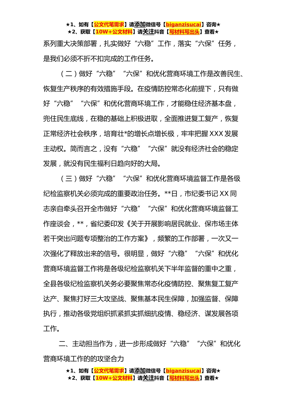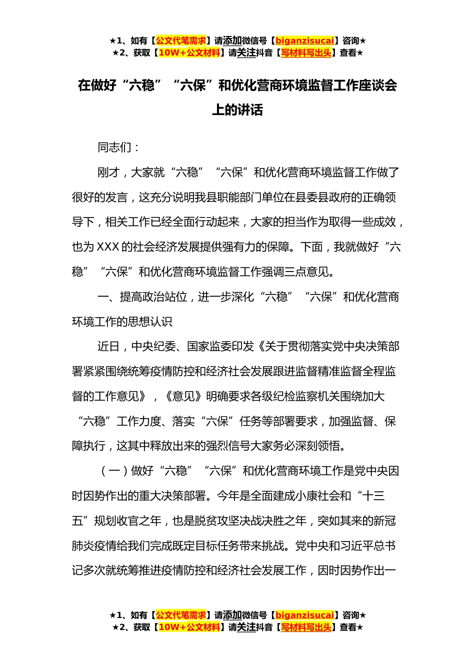 ★1、如有【公文代笔需求】请添加微信号【biganzisucai】咨询★★2、获取【10W+公文材料】请关注抖音【写材料写出头】查看★在做好“六稳”“六保”和优化营商环境监督工作座谈会上的讲话同志们:刚才,大家就“六稳”“六保”和优化营商环境监督工作做了很好的发言,这充分说明我县职能部门单位在县委县政府的正确领导下,相关工作已经全面行动起来,大家的担当作为取得一些成效,也为XXX的社会经济发展提供强有力的保障。下面,我就做好“六稳”“六保”和优化营商环境监督工作强调三点意见。一、提高政治站位,进一步深化“六稳”“六保”和优化营商环境工作的思想认识近日,中央纪委、国家监委印发《关于贯彻落实党中央决策部署紧紧围绕统筹疫情防控和经济社会发展跟进监督精准监督全程监督的工作意见》,《意...