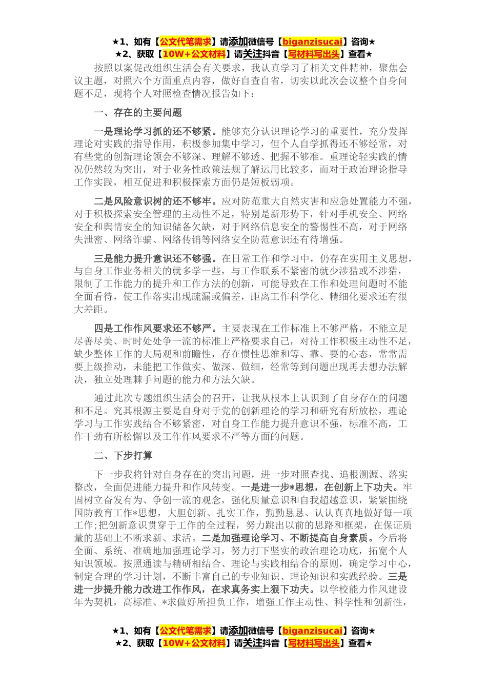 ★1、如有【公文代笔需求】请添加微信号【biganzisucai】咨询★★2、获取【10W+公文材料】请关注抖音【写材料写出头】查看★按照以案促改组织生活会有关要求,我认真学习了相关文件精神,聚焦会议主题,对照六个方面重点内容,做好自查自省,切实以此次会议整个自身问题不足,现将个人对照检查情况报告如下:一、存在的主要问题一是理论学习抓的还不够紧。能够充分认识理论学习的重要性,充分发挥理论对实践的指导作用,积极参加集中学习,但个人自学抓得还不够经常,对有些党的创新理论领会不够深、理解不够透、把握不够准。重理论轻实践的情况仍然较为突出,对于业务性政策法规了解运用比较多,而对于政治理论指导工作实践,相互促进和积极探索方面仍是短板弱项。二是风险意识树的还不够牢。应对防范重大自然灾...