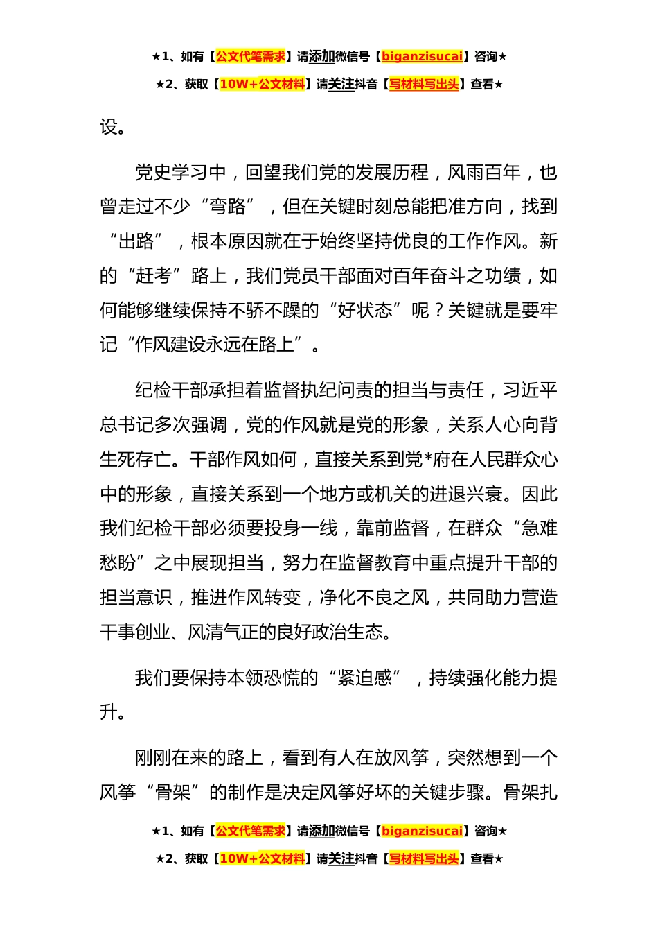 ★1、如有【公文代笔需求】请添加微信号【biganzisucai】咨询★★2、获取【10W+公文材料】请关注抖音【写材料写出头】查看★乡镇纪检干部演讲稿:强化作风提本领实干之处显担当大家好!我是来自xx镇纪委的xx,今天很荣幸能够在这里和大家分享我的演讲内容,我今天演讲的题目是《强化作风提本领实干之处显担当》。比赛开始之前,通过学习《全市作风革命二十条措施》及相关文件精神,又在台下聆听了各位同事的分享,让我对今天的演讲主题有了更深刻的认识,更加明白“强作风强能力强机关”对于我们每一个纪检干部所意味的责任。在我看来,强作风是前提,强能力是基础,而强机关才是目的,三者之中存在着相辅相成、层层递进的关系。作风强则能力强,能力强则机关强。我们作为纪检干部,更要乘着全市作风革命的契机,...