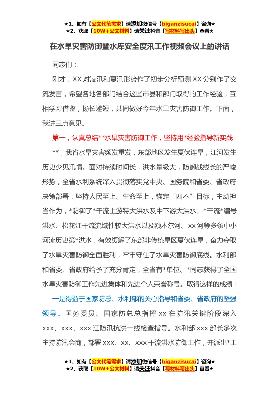 ★1、如有【公文代笔需求】请添加微信号【biganzisucai】咨询★★2、获取【10W+公文材料】请关注抖音【写材料写出头】查看★在水旱灾害防御暨水库安全度汛工作视频会议上的讲话同志们:刚才,XX对凌汛和夏汛形势作了初步分析预测XX分别作了交流发言,希望各地各部门结合这些市县和部门取得的工作经验,互相学习借鉴,扬长避短,共同做好今年水旱灾害防御工作。下面,我讲三点意见。第一,认真总结**水旱灾害防御工作,坚持用*经验指导新实践**,我省水旱灾害频发重发,东部地区发生夏伏连旱,江河发生历史少见汛情。面对持续时间长,洪水量级大,防御战线长的严峻形势,全省水利系统深入贯彻落实党中央、国务院和省委、省政府决策部署,坚持人民至上、生命至上,锚定“四不”目标,主动担当作为,*防御了*干流上游...