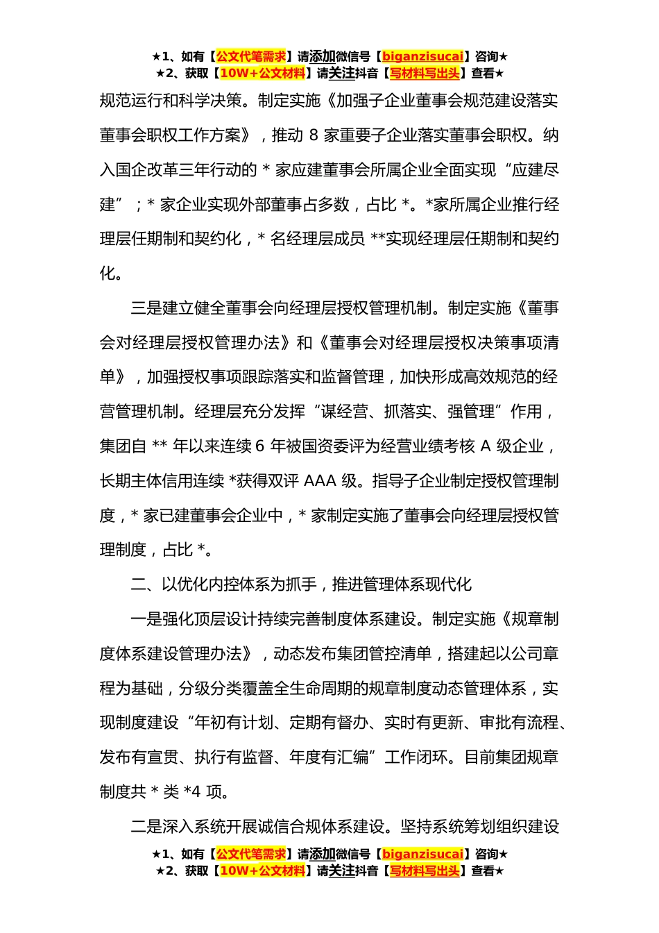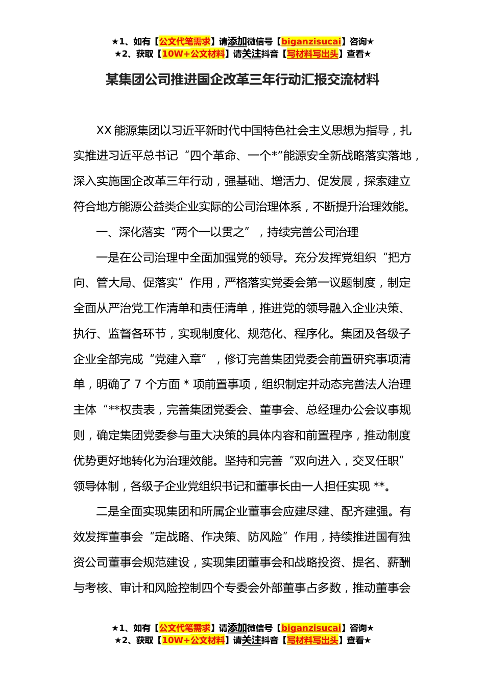 ★1、如有【公文代笔需求】请添加微信号【biganzisucai】咨询★★2、获取【10W+公文材料】请关注抖音【写材料写出头】查看★某集团公司推进国企改革三年行动汇报交流材料XX能源集团以习近平新时代中国特色社会主义思想为指导,扎实推进习近平总书记“四个革命、一个*”能源安全新战略落实落地,深入实施国企改革三年行动,强基础、增活力、促发展,探索建立符合地方能源公益类企业实际的公司治理体系,不断提升治理效能。一、深化落实“两个一以贯之”,持续完善公司治理一是在公司治理中全面加强党的领导。充分发挥党组织“把方向、管大局、促落实”作用,严格落实党委会第一议题制度,制定全面从严治党工作清单和责任清单,推进党的领导融入企业决策、执行、监督各环节,实现制度化、规范化、程序化。集团及各级...