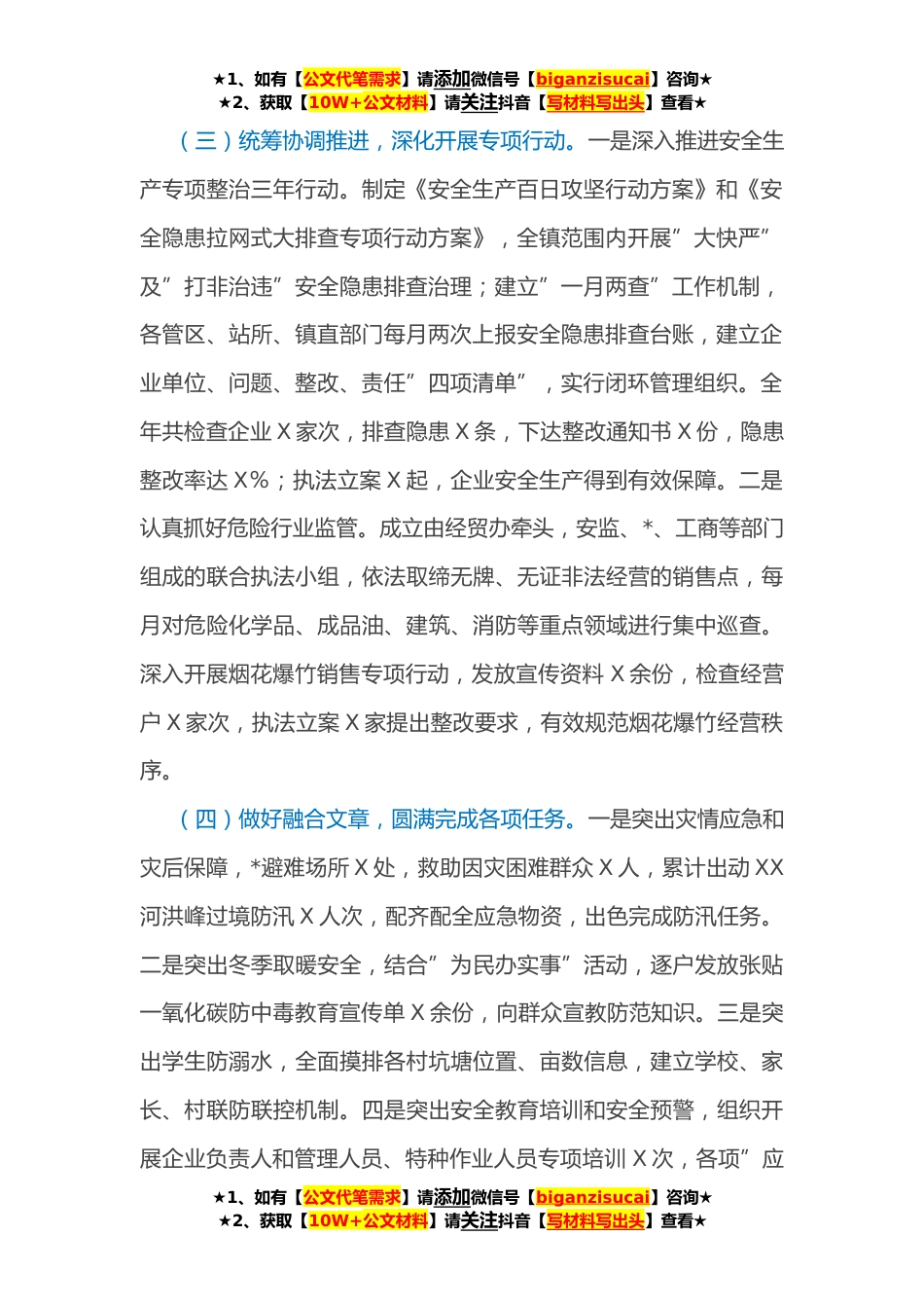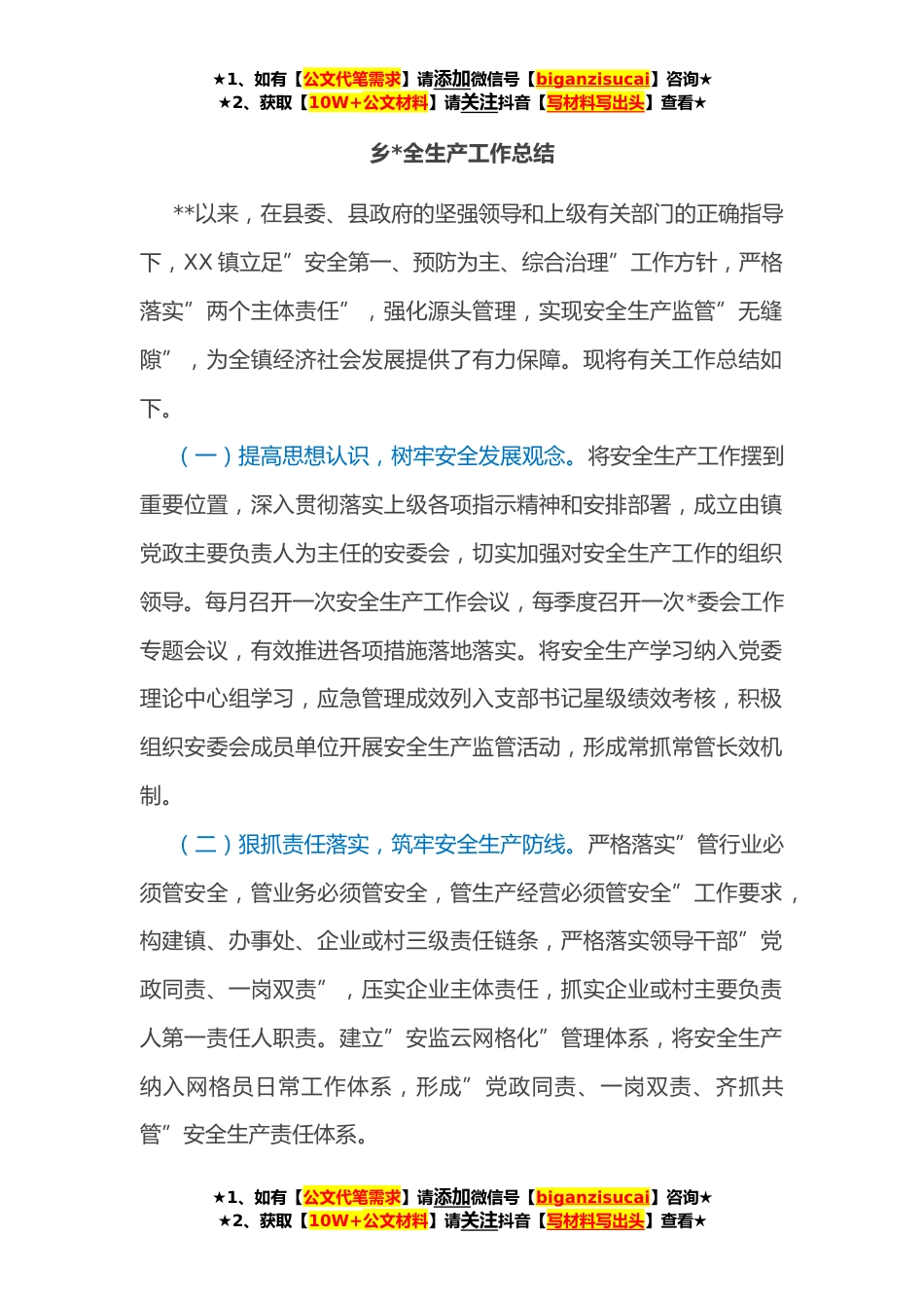 ★1、如有【公文代笔需求】请添加微信号【biganzisucai】咨询★★2、获取【10W+公文材料】请关注抖音【写材料写出头】查看★乡*全生产工作总结**以来,在县委、县政府的坚强领导和上级有关部门的正确指导下,XX镇立足”安全第一、预防为主、综合治理”工作方针,严格落实”两个主体责任”,强化源头管理,实现安全生产监管”无缝隙”,为全镇经济社会发展提供了有力保障。现将有关工作总结如下。(一)提高思想认识,树牢安全发展观念。将安全生产工作摆到重要位置,深入贯彻落实上级各项指示精神和安排部署,成立由镇党政主要负责人为主任的安委会,切实加强对安全生产工作的组织领导。每月召开一次安全生产工作会议,每季度召开一次*委会工作专题会议,有效推进各项措施落地落实。将安全生产学习纳入党委理论中...