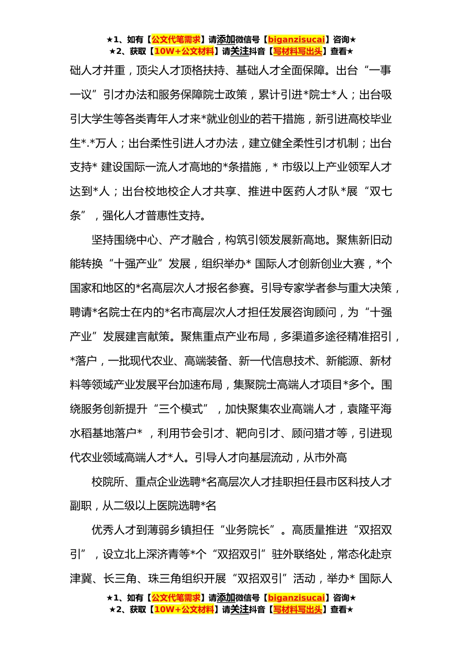 ★1、如有【公文代笔需求】请添加微信号【biganzisucai】咨询★★2、获取【10W+公文材料】请关注抖音【写材料写出头】查看★改革激发人才活力赋能现代化高品质城市建设加快建设现代化高品质城市,改革是关键一招,人才是第一*。市委组织部认真履行党的建设制度改革和人才制度改革创新攻坚牵头职责,聚焦现代化高品质城市建设需求,更加积极有效地改进人才供给侧,创新全周期人才招引服务机制,人才发展呈现出量增质提、活力迸发的良好局面。在今年公布的最具人才吸引力城市*强中,我市位居全国第*位、全省第*位。坚持党管人才、优化机制,增创区域竞争新优势。实施市县镇三级书记人才项目,发布“人才*倡议”,强化“书记抓、抓书记”,市级领导班子成员带头招才引智,凝聚起强大工作合力。坚持“管行业就要管人才...