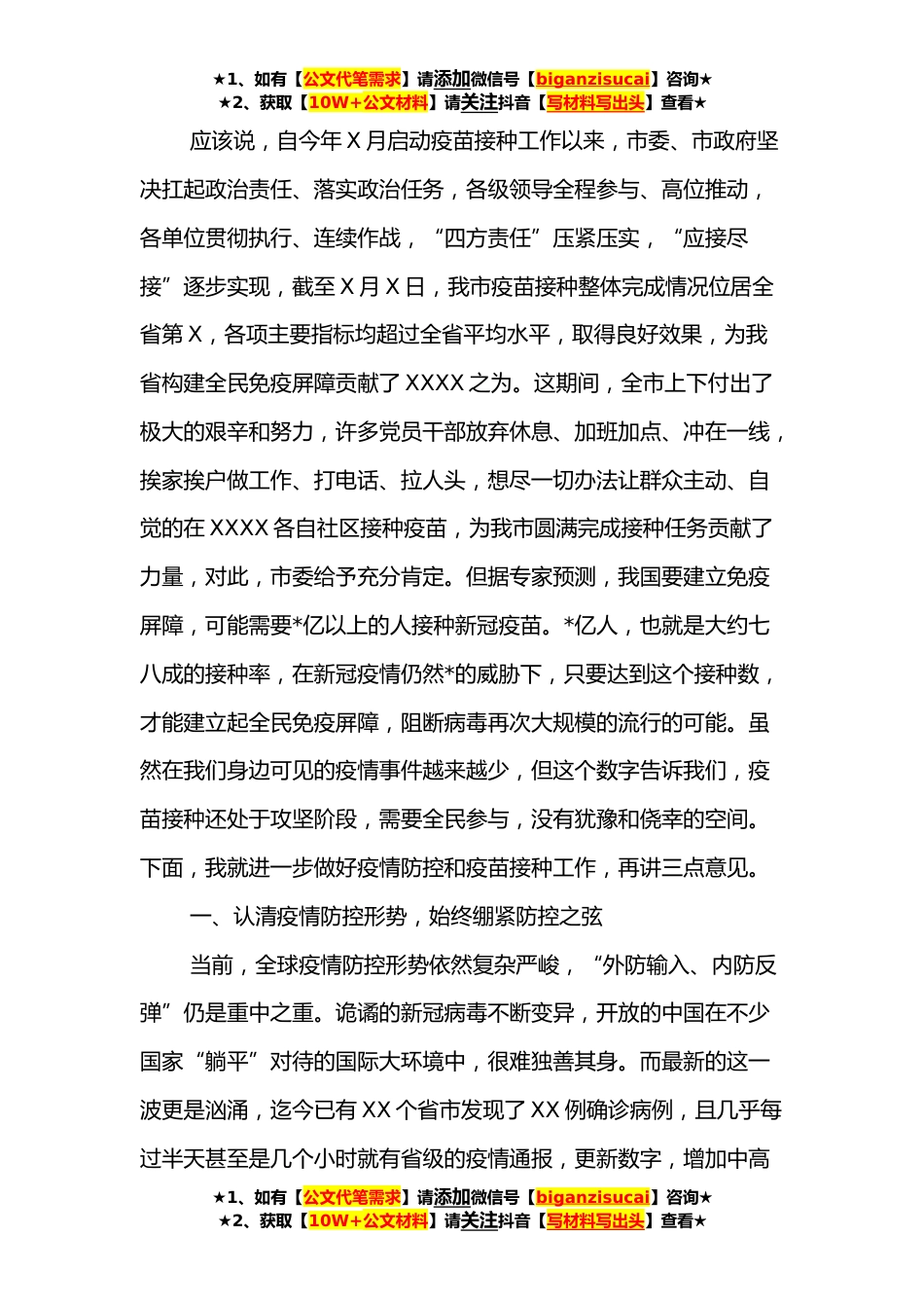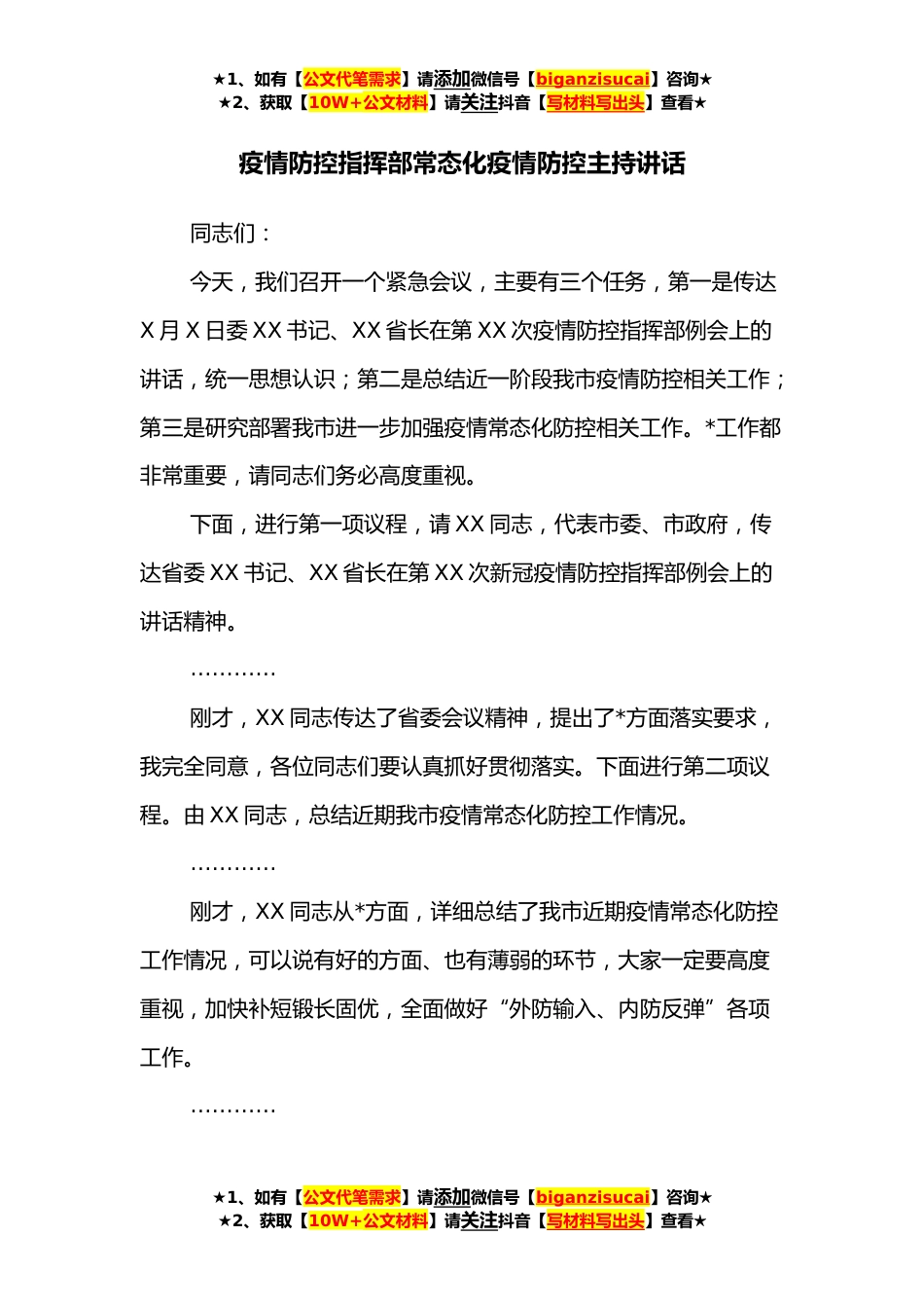 ★1、如有【公文代笔需求】请添加微信号【biganzisucai】咨询★★2、获取【10W+公文材料】请关注抖音【写材料写出头】查看★疫情防控指挥部常态化疫情防控主持讲话同志们:今天,我们召开一个紧急会议,主要有三个任务,第一是传达X月X日委XX书记、XX省长在第XX次疫情防控指挥部例会上的讲话,统一思想认识;第二是总结近一阶段我市疫情防控相关工作;第三是研究部署我市进一步加强疫情常态化防控相关工作。*工作都非常重要,请同志们务必高度重视。下面,进行第一项议程,请XX同志,代表市委、市政府,传达省委XX书记、XX省长在第XX次新冠疫情防控指挥部例会上的讲话精神。…………刚才,XX同志传达了省委会议精神,提出了*方面落实要求,我完全同意,各位同志们要认真抓好贯彻落实。下面进行第二项议程。由XX同...