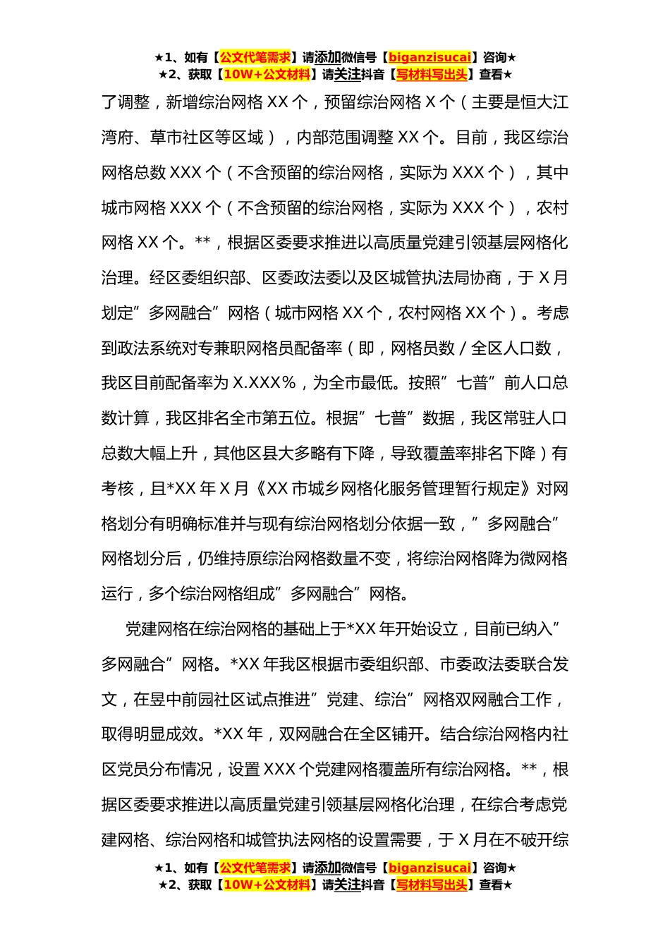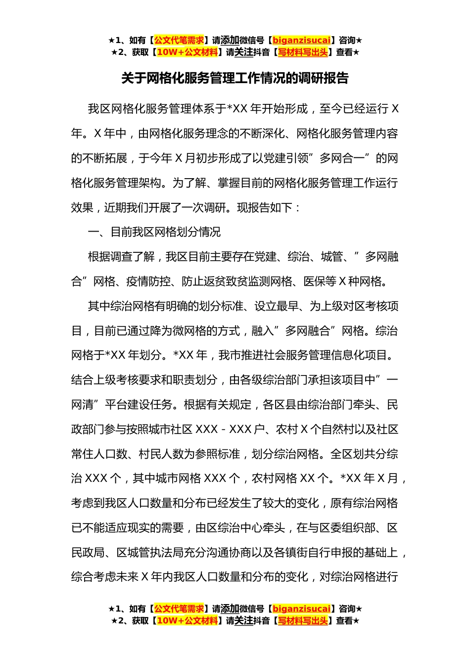 ★1、如有【公文代笔需求】请添加微信号【biganzisucai】咨询★★2、获取【10W+公文材料】请关注抖音【写材料写出头】查看★关于网格化服务管理工作情况的调研报告我区网格化服务管理体系于*XX年开始形成,至今已经运行X年。X年中,由网格化服务理念的不断深化、网格化服务管理内容的不断拓展,于今年X月初步形成了以党建引领”多网合一”的网格化服务管理架构。为了解、掌握目前的网格化服务管理工作运行效果,近期我们开展了一次调研。现报告如下:一、目前我区网格划分情况根据调查了解,我区目前主要存在党建、综治、城管、”多网融合”网格、疫情防控、防止返贫致贫监测网格、医保等X种网格。其中综治网格有明确的划分标准、设立最早、为上级对区考核项目,目前已通过降为微网格的方式,融入”多网融合”网格...