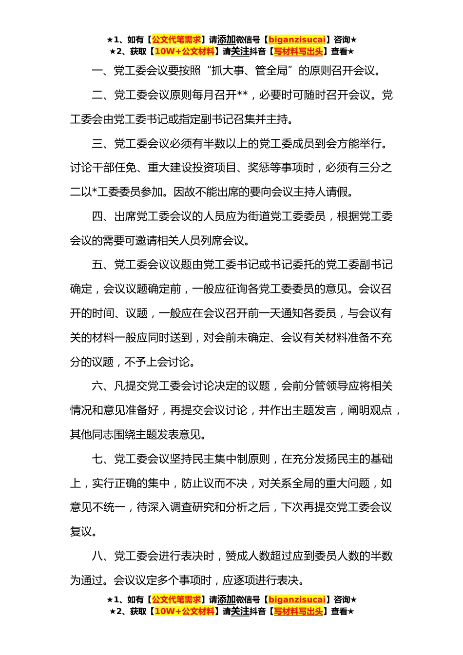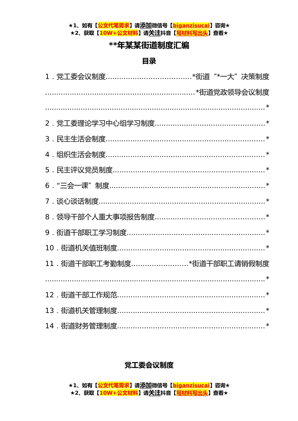★1、如有【公文代笔需求】请添加微信号【biganzisucai】咨询★★2、获取【10W+公文材料】请关注抖音【写材料写出头】查看★**年某某街道制度汇编目录1.党工委会议制度......................................*街道“*一大”决策制度...................................................................*街道党政领导会议制度...................................................................................................*2.党工委理论学习中心组学习制度.................................................*3.民主生活会制度.......................................................................*4.组织生活会制度..........................................................................