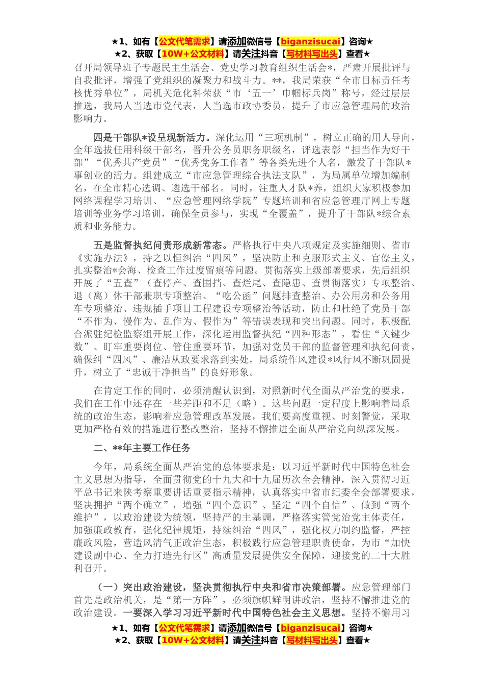★1、如有【公文代笔需求】请添加微信号【biganzisucai】咨询★★2、获取【10W+公文材料】请关注抖音【写材料写出头】查看★同志们:今天我们召开局系统**年全面从严治党工作会议,主要任务是学习贯彻市纪委全会精神,回顾总结我局过去一年全面从严治党工作,安排部署今年重点工作任务。刚才,传达学习了市纪委全会精神,观看了警示教育片,并签订了《党风廉政建设责任书》。派驻纪检组副组长同志讲话并提出了很好的指导意见,希望大家认真学习领会,扎实抓好贯彻落实,以全面从严治党和党风廉政建设新成效,推进应急管理事业创新发展。下面,我讲两个方面的意见:一、**工作回顾**是党和国家发展历史上具有特殊重要意义的一年,是全市应急管理系统践行初心使命、经受艰难考验的一年,也是全面从严治党纵深推进的...