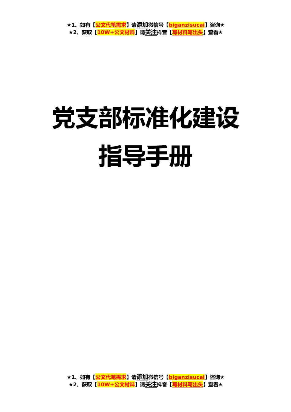 ★1、如有【公文代笔需求】请添加微信号【biganzisucai】咨询★★2、获取【10W+公文材料】请关注抖音【写材料写出头】查看★党支部标准化建设指导手册★1、如有【公文代笔需求】请添加微信号【biganzisucai】咨询★★2、获取【10W+公文材料】请关注抖音【写材料写出头】查看★★1、如有【公文代笔需求】请添加微信号【biganzisucai】咨询★★2、获取【10W+公文材料】请关注抖音【写材料写出头】查看★目录一、政治建设标准*(一)政治建设和思想建设工作规范*(二)党支部组织力提升工作规范*(三)党支部作风建设规范*二、组织建设标准*(四)党支部设置规范*(五)党支部议事规范*(六)党支部换届选举规范*(七)软弱涣散党支部整顿工作规范*(八)党支部组织宣传凝聚服务群众实施规范*(九)党支部党务公开规...