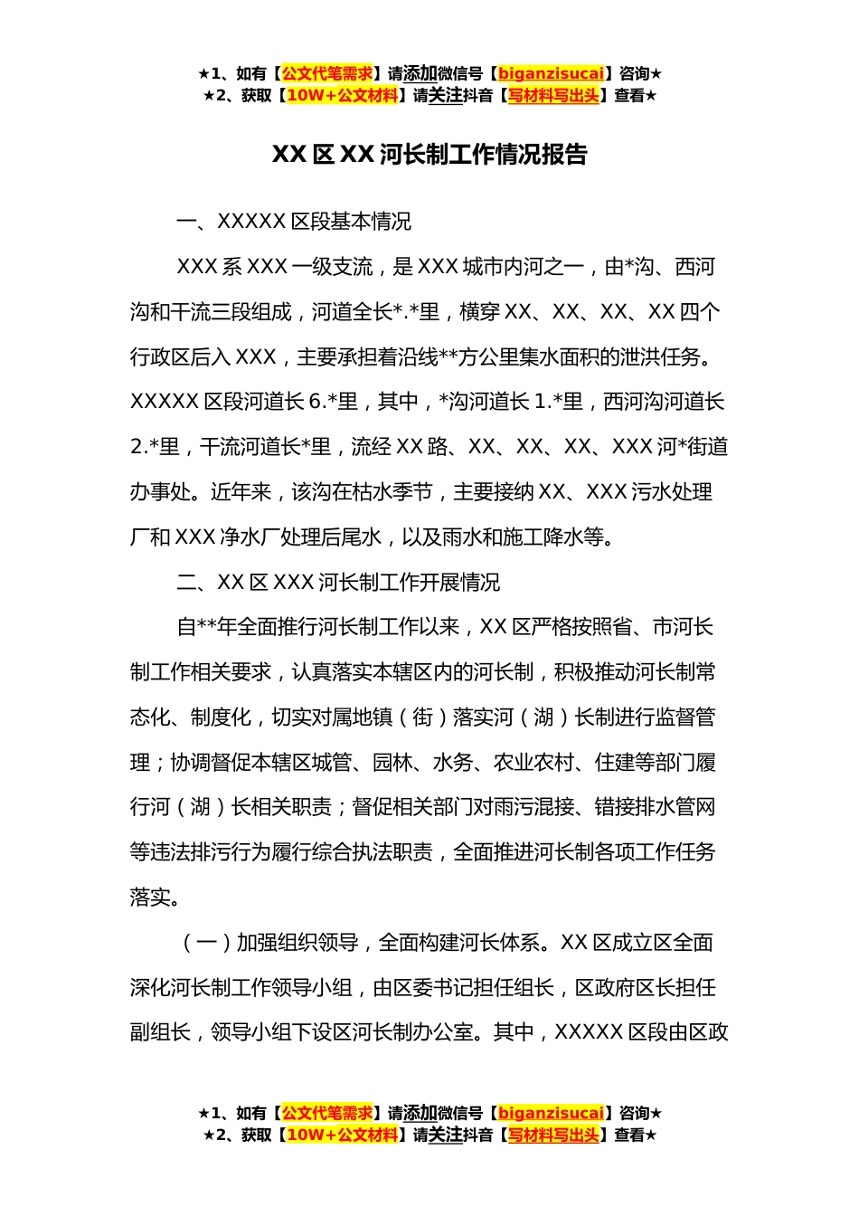 ★1、如有【公文代笔需求】请添加微信号【biganzisucai】咨询★★2、获取【10W+公文材料】请关注抖音【写材料写出头】查看★XX区XX河长制工作情况报告一、XXXXX区段基本情况XXX系XXX一级支流,是XXX城市内河之一,由*沟、西河沟和干流三段组成,河道全长*.*里,横穿XX、XX、XX、XX四个行政区后入XXX,主要承担着沿线**方公里集水面积的泄洪任务。XXXXX区段河道长6.*里,其中,*沟河道长1.*里,西河沟河道长2.*里,干流河道长*里,流经XX路、XX、XX、XX、XXX河*街道办事处。近年来,该沟在枯水季节,主要接纳XX、XXX污水处理厂和XXX净水厂处理后尾水,以及雨水和施工降水等。二、XX区XXX河长制工作开展情况自**年全面推行河长制工作以来,XX区严格按照省、市河长制工作相关要求,认真落实本辖区内的河长制,积极推...