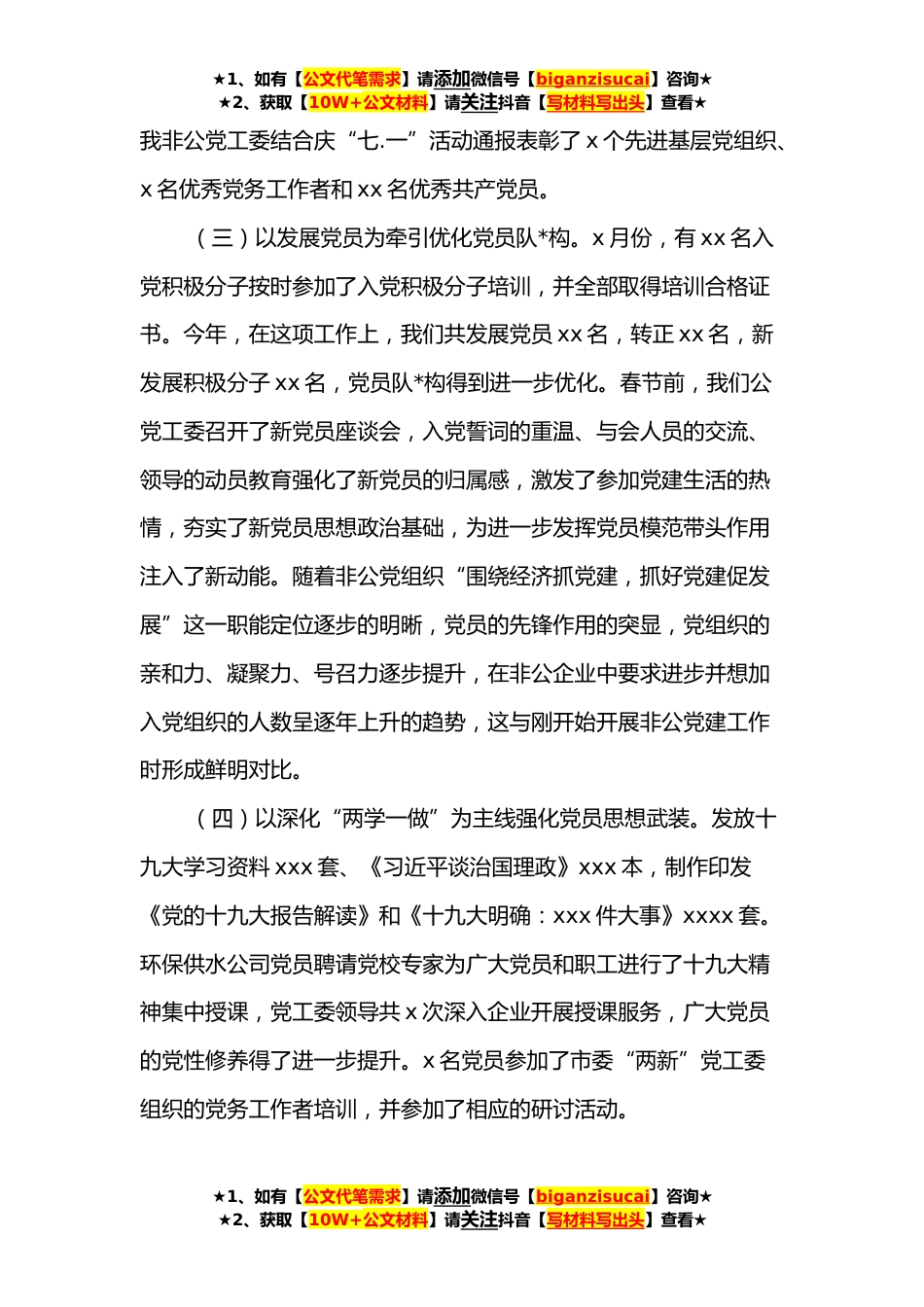 ★1、如有【公文代笔需求】请添加微信号【biganzisucai】咨询★★2、获取【10W+公文材料】请关注抖音【写材料写出头】查看★非公企业党建工作汇报xxxx年,我们党工委在市委组织部和市委“两新”组织党工委的正确领导下,按照“围绕经济抓党建,抓好党建促发展”的总体工作思路,紧紧围绕全*心工作深入推进阵地建设标准化、学习教育常态化、党建工作品牌化“三化”工程,*思想、求真务实、拼搏进取,各项工作齐头并进,同时也取得了预期的效果。一、简要工作回顾(一)以丰富文体活动为抓手激发社会正能量。承办了庆七一暨“两新”组织职工篮球邀请赛,共有xx支球队参加了邀请赛。通过承办篮球邀请赛,彰显运动员昂扬向上的精神风貌,在广大党员中营造对标先进、激情工作、奋发有为的浓厚氛围,以优良党风带民风促...