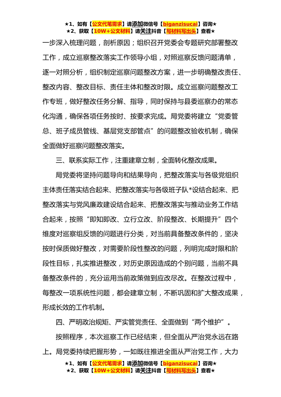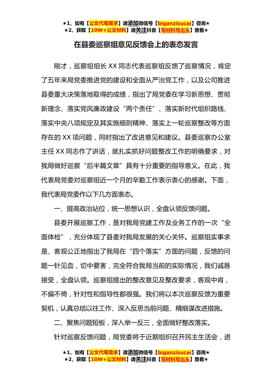★1、如有【公文代笔需求】请添加微信号【biganzisucai】咨询★★2、获取【10W+公文材料】请关注抖音【写材料写出头】查看★在县委巡察组意见反馈会上的表态发言刚才,巡察组组长XX同志代表巡察组反馈了巡察情况,肯定了五年来局党委推进党的建设和全面从严治党工作,以及公司推进县委重大决策落地取得的成绩,指出了局党委在学习新思想、贯彻新理念、落实党风廉政建设“两个责任”、落实新时代组织路线、落实中央八项规定及其实施细则精神、落实上一轮巡察整改等方面存在的XX项问题,同时指出了改进意见和建议。县委巡察办公室主任XX同志作了讲话,就扎实抓好问题整改工作的明确要求,对我局做好巡察“后半篇文章”具有十分重要的指导意义。在此,我代表局党委对巡察组近一个月的辛勤工作表示衷心的感谢。下面,...