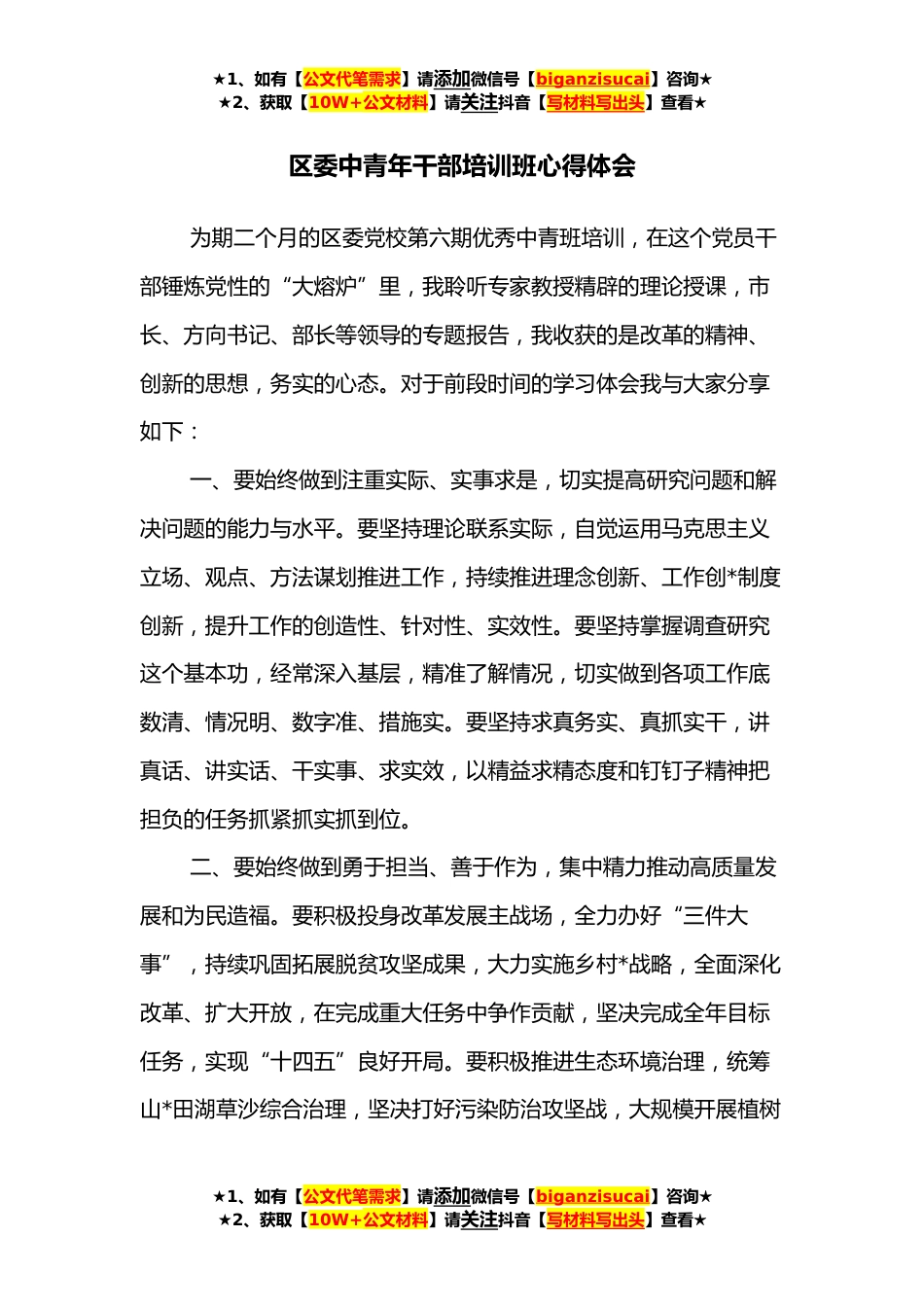 ★1、如有【公文代笔需求】请添加微信号【biganzisucai】咨询★★2、获取【10W+公文材料】请关注抖音【写材料写出头】查看★区委中青年干部培训班心得体会为期二个月的区委党校第六期优秀中青班培训,在这个党员干部锤炼党性的“大熔炉”里,我聆听专家教授精辟的理论授课,市长、方向书记、部长等领导的专题报告,我收获的是改革的精神、创新的思想,务实的心态。对于前段时间的学习体会我与大家分享如下:一、要始终做到注重实际、实事求是,切实提高研究问题和解决问题的能力与水平。要坚持理论联系实际,自觉运用马克思主义立场、观点、方法谋划推进工作,持续推进理念创新、工作创*制度创新,提升工作的创造性、针对性、实效性。要坚持掌握调查研究这个基本功,经常深入基层,精准了解情况,切实做到各项工作...