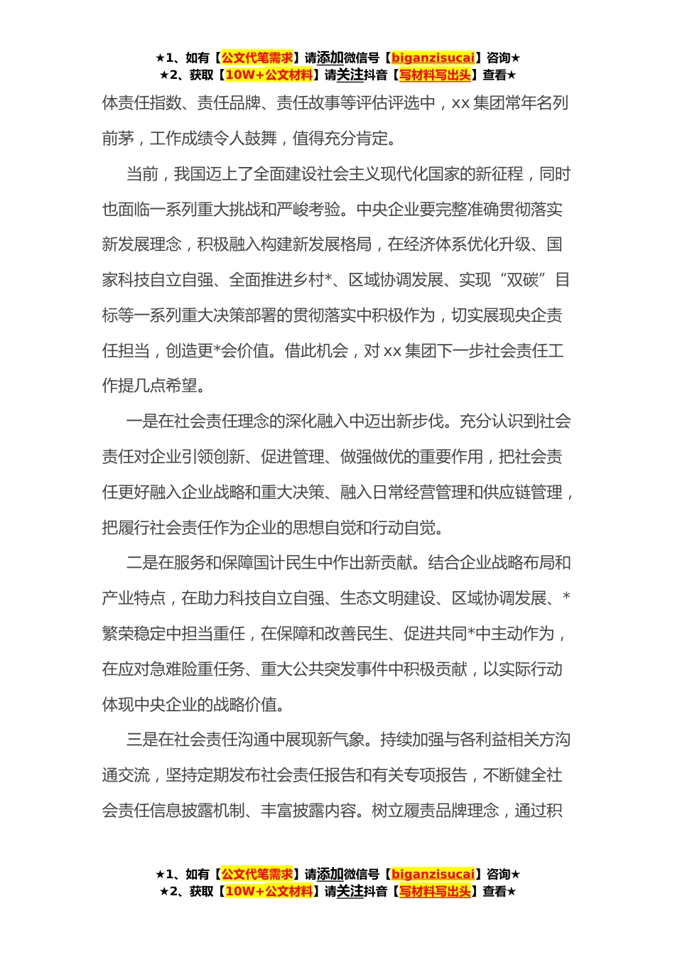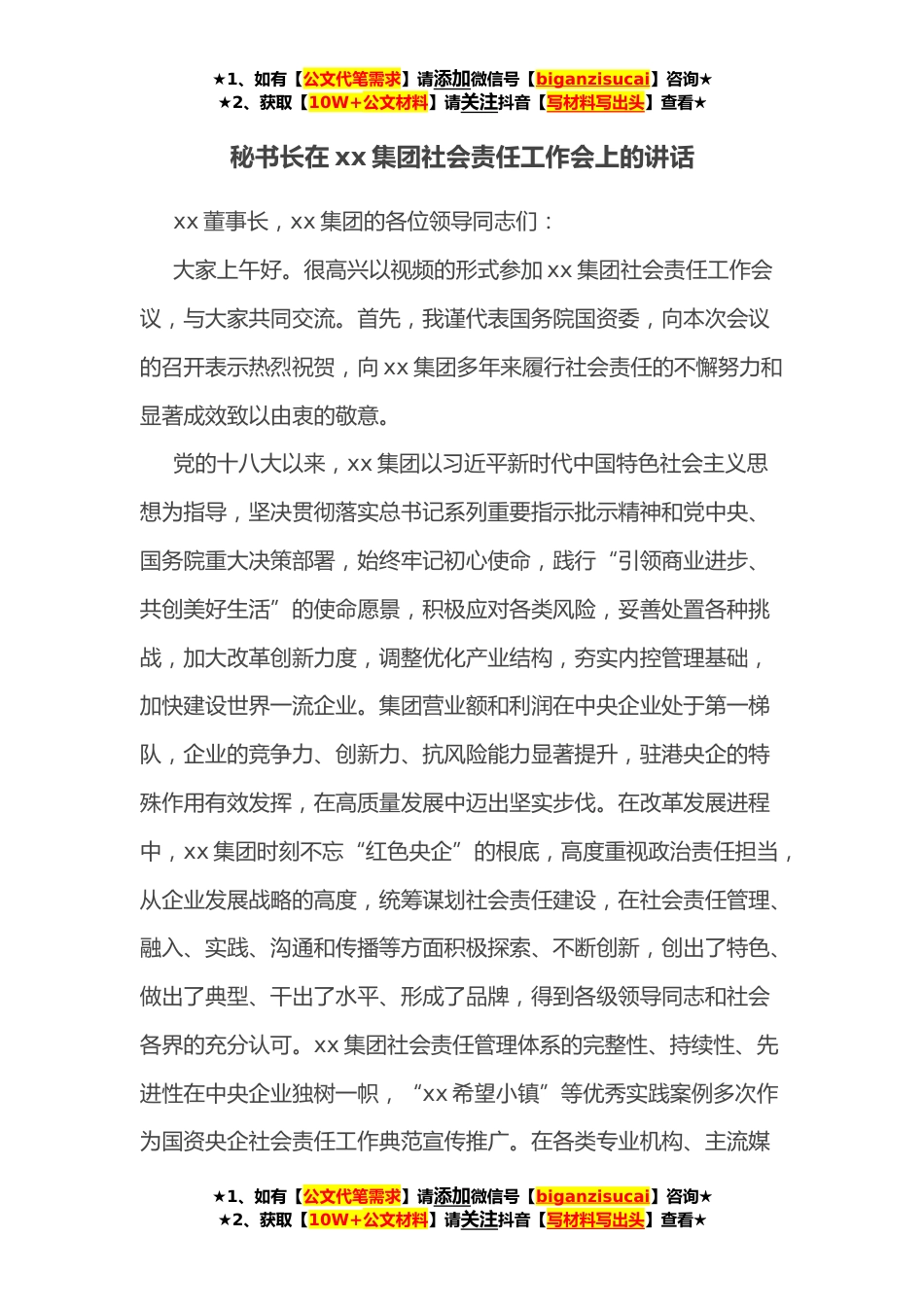 ★1、如有【公文代笔需求】请添加微信号【biganzisucai】咨询★★2、获取【10W+公文材料】请关注抖音【写材料写出头】查看★秘书长在xx集团社会责任工作会上的讲话xx董事长,xx集团的各位领导同志们:大家上午好。很高兴以视频的形式参加xx集团社会责任工作会议,与大家共同交流。首先,我谨代表国务院国资委,向本次会议的召开表示热烈祝贺,向xx集团多年来履行社会责任的不懈努力和显著成效致以由衷的敬意。党的十八大以来,xx集团以习近平新时代中国特色社会主义思想为指导,坚决贯彻落实总书记系列重要指示批示精神和党中央、国务院重大决策部署,始终牢记初心使命,践行“引领商业进步、共创美好生活”的使命愿景,积极应对各类风险,妥善处置各种挑战,加大改革创新力度,调整优化产业结构,夯实内控管理基...