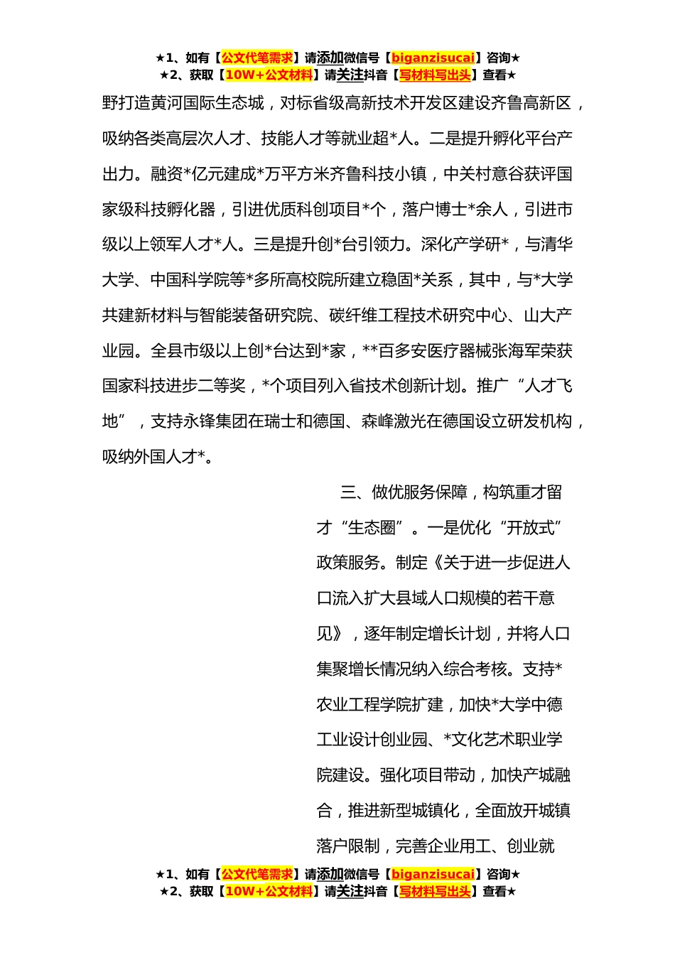 ★1、如有【公文代笔需求】请添加微信号【biganzisucai】咨询★★2、获取【10W+公文材料】请关注抖音【写材料写出头】查看★某县人才工作经验材料近年来,我县深入贯彻落实中央和省委、市委工作部署,牢固确立人才引领发展的战略地位,坚持“人人都是人才”,全力吸纳人口、招引人才、聚集人气,为高质量发展提供了有力人才智力支撑。**位居全国科技创新百强第*位,获评全市首个创业型城市,荣获**度省人才工作表现突出单位,人口净流出局面近*年首次扭转。一、推动政策创新,打造引才聚才“强磁场”。全面优化提升人才政策,坚持“不唯条件、不限地域、不拘一格”,针对不同人才分类施策。一是对事业单位人员,做到“*槛”。启动异地事业单位在编人员回引;取消教育、卫生等人才引进各类限制,去年以来累计招聘、...