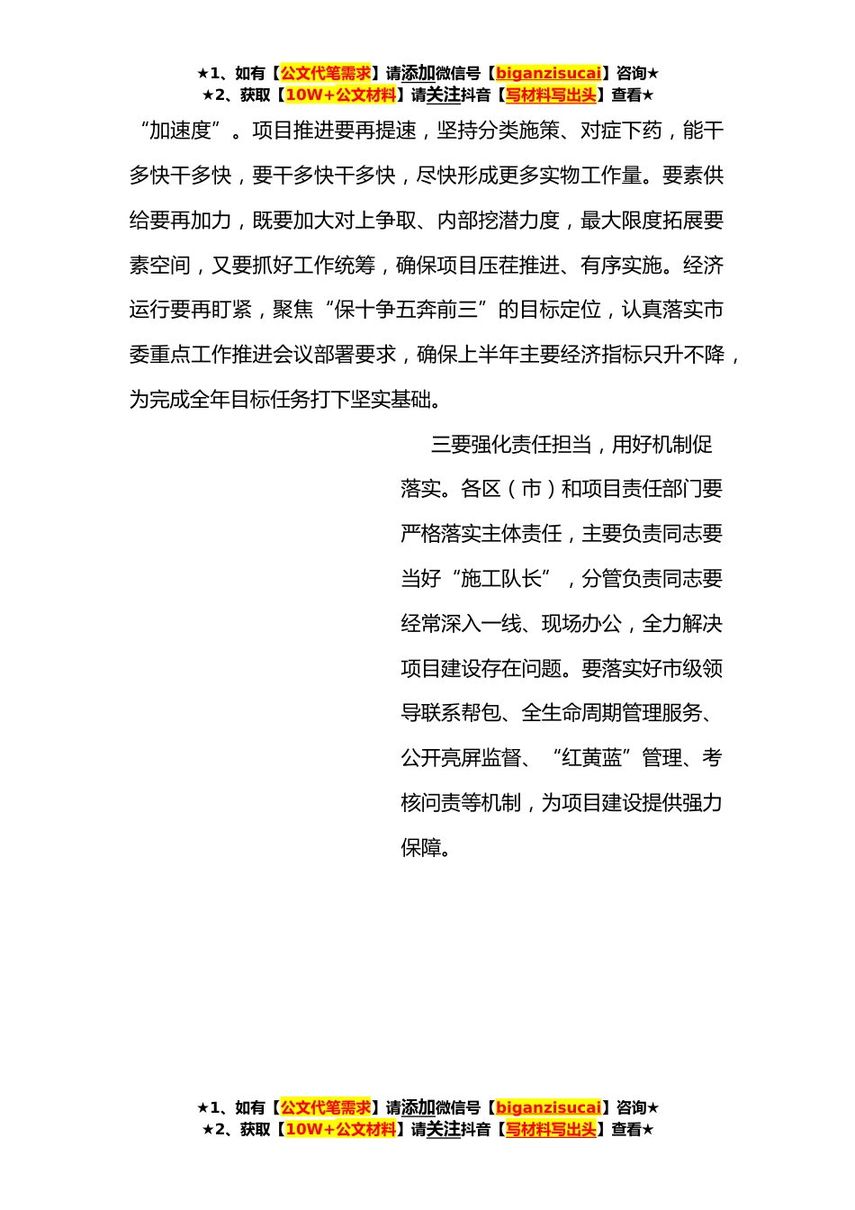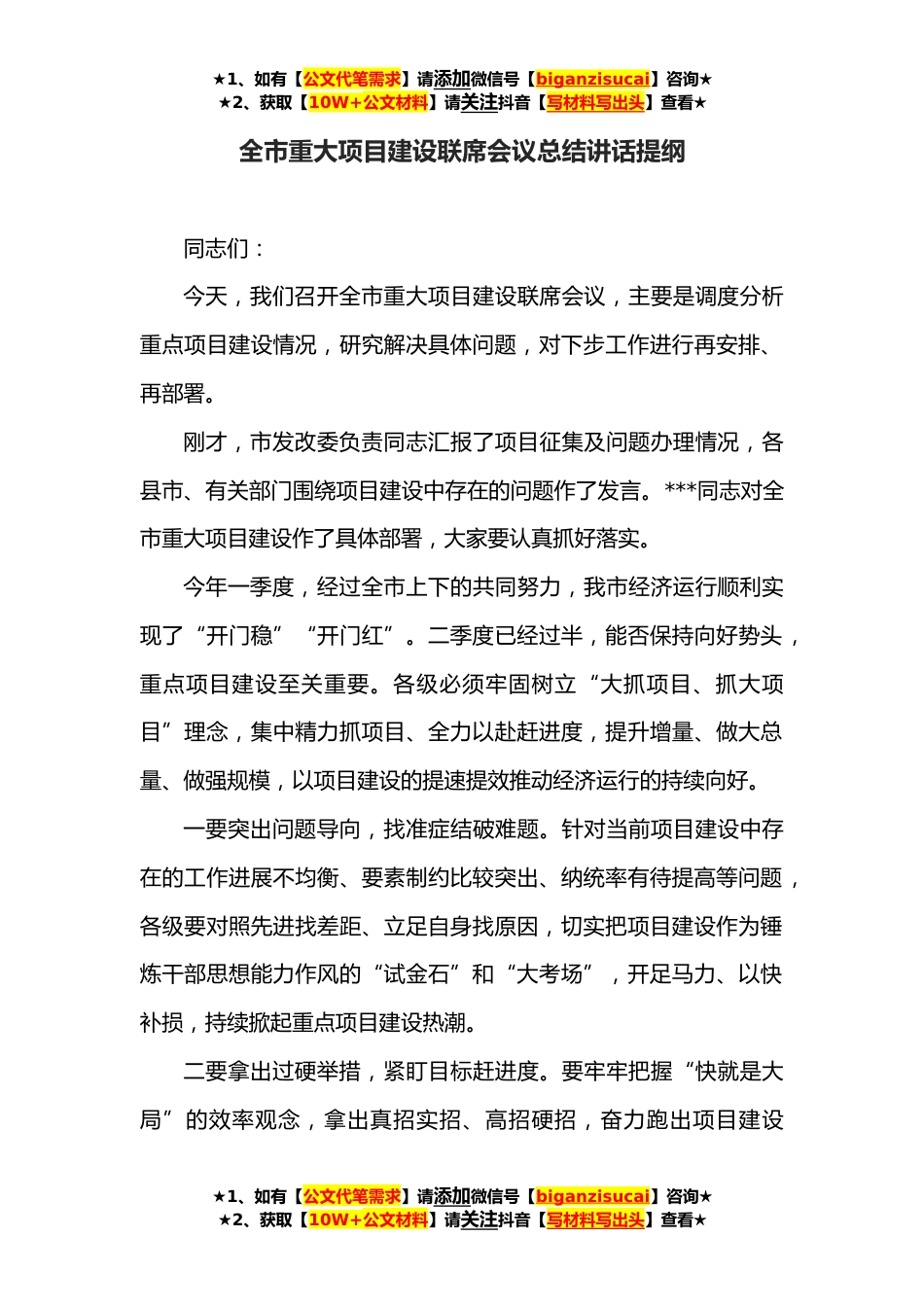 ★1、如有【公文代笔需求】请添加微信号【biganzisucai】咨询★★2、获取【10W+公文材料】请关注抖音【写材料写出头】查看★全市重大项目建设联席会议总结讲话提纲同志们:今天,我们召开全市重大项目建设联席会议,主要是调度分析重点项目建设情况,研究解决具体问题,对下步工作进行再安排、再部署。刚才,市发改委负责同志汇报了项目征集及问题办理情况,各县市、有关部门围绕项目建设中存在的问题作了发言。***同志对全市重大项目建设作了具体部署,大家要认真抓好落实。今年一季度,经过全市上下的共同努力,我市经济运行顺利实现了“开门稳”“开门红”。二季度已经过半,能否保持向好势头,重点项目建设至关重要。各级必须牢固树立“大抓项目、抓大项目”理念,集中精力抓项目、全力以赴赶进度,提升增量、...
