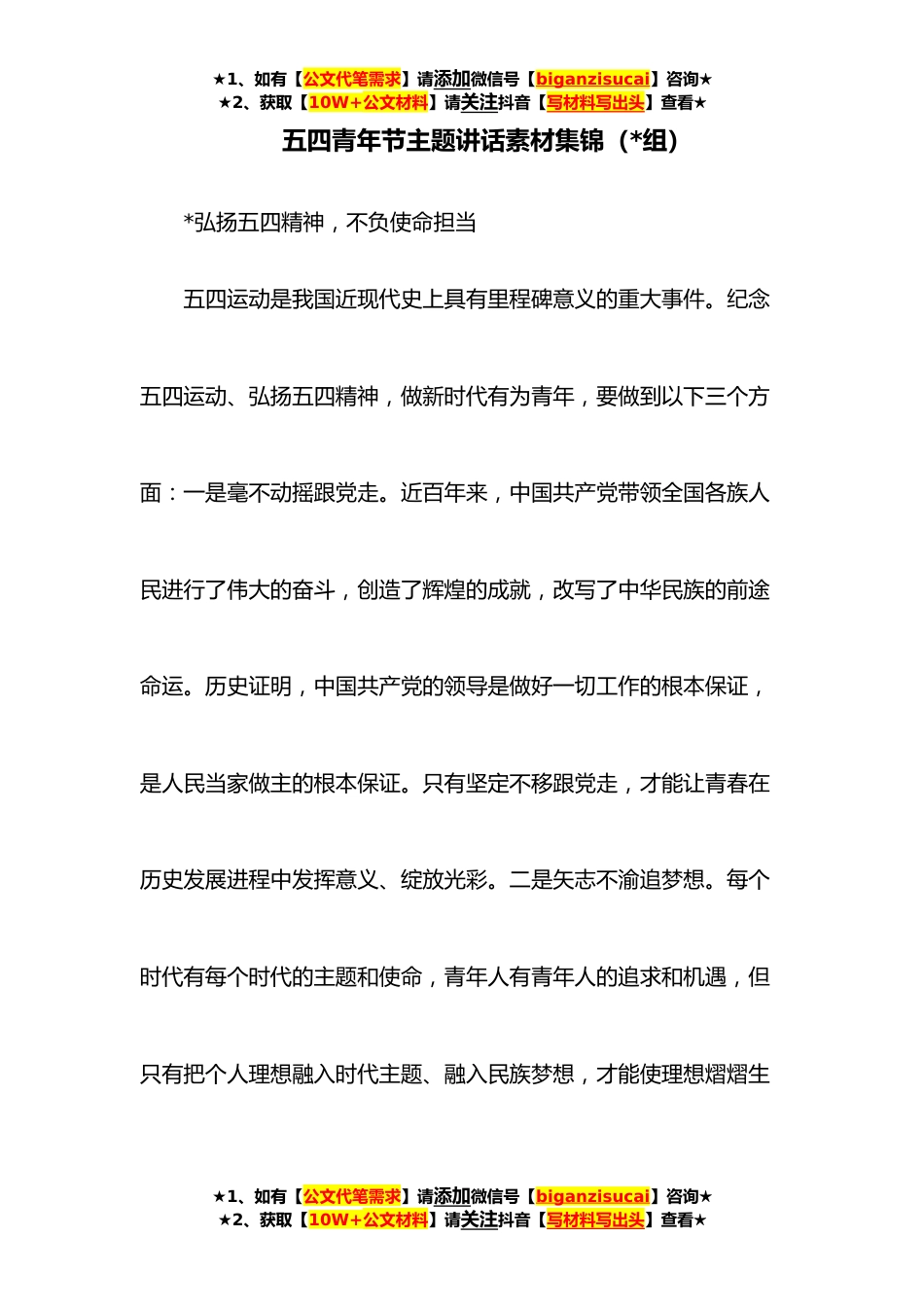 ★1、如有【公文代笔需求】请添加微信号【biganzisucai】咨询★★2、获取【10W+公文材料】请关注抖音【写材料写出头】查看★五四青年节主题讲话素材集锦(*组)*弘扬五四精神,不负使命担当五四运动是我国近现代史上具有里程碑意义的重大事件。纪念五四运动、弘扬五四精神,做新时代有为青年,要做到以下三个方面:一是毫不动摇跟党走。近百年来,中国共产党带领全国各族人民进行了伟大的奋斗,创造了辉煌的成就,改写了中华民族的前途命运。历史证明,中国共产党的领导是做好一切工作的根本保证,是人民当家做主的根本保证。只有坚定不移跟党走,才能让青春在历史发展进程中发挥意义、绽放光彩。二是矢志不渝追梦想。每个时代有每个时代的主题和使命,青年人有青年人的追求和机遇,但只有把个人理想融入时代主题...