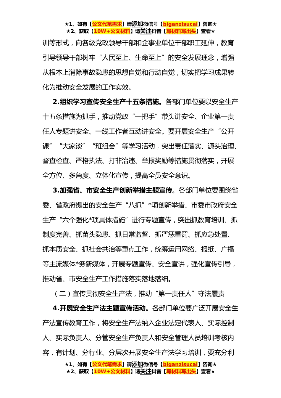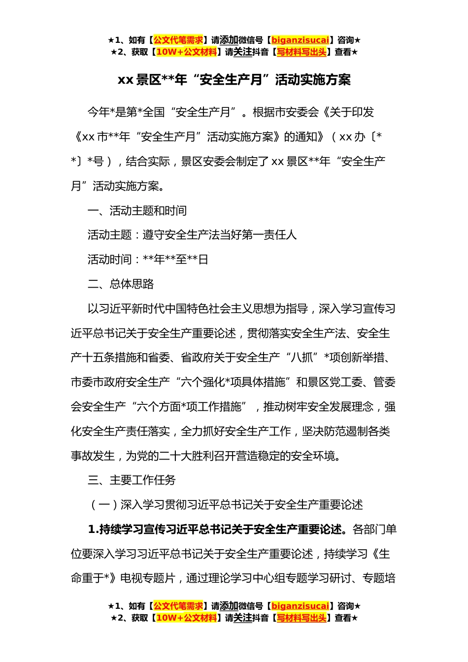 ★1、如有【公文代笔需求】请添加微信号【biganzisucai】咨询★★2、获取【10W+公文材料】请关注抖音【写材料写出头】查看★xx景区**年“安全生产月”活动实施方案今年*是第*全国“安全生产月”。根据市安委会《关于印发《xx市**年“安全生产月”活动实施方案》的通知》(xx办〔**〕*号),结合实际,景区安委会制定了xx景区**年“安全生产月”活动实施方案。一、活动主题和时间活动主题:遵守安全生产法当好第一责任人活动时间:**年**至**日二、总体思路以习近平新时代中国特色社会主义思想为指导,深入学习宣传习近平总书记关于安全生产重要论述,贯彻落实安全生产法、安全生产十五条措施和省委、省政府关于安全生产“八抓”*项创新举措、市委市政府安全生产“六个强化*项具体措施”和景区党工委、管委会安全生...