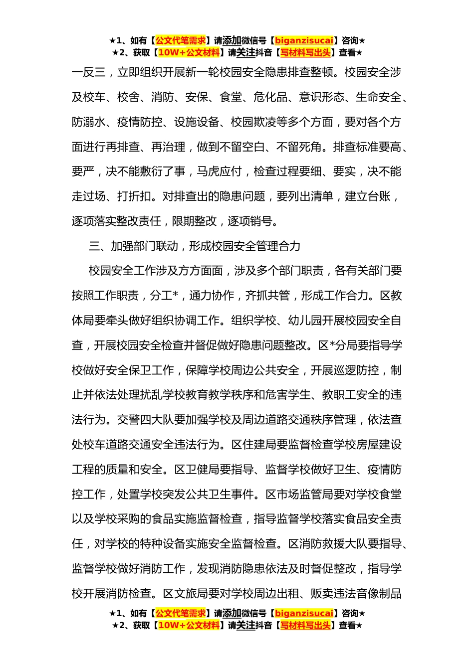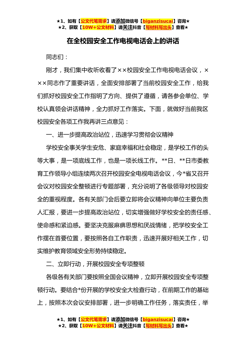 ★1、如有【公文代笔需求】请添加微信号【biganzisucai】咨询★★2、获取【10W+公文材料】请关注抖音【写材料写出头】查看★在全校园安全工作电视电话会上的讲话同志们:刚才,我们集中收听收看了××校园安全工作电视电话会议,×××同志作了重要讲话,全面安排部署了当前校园安全工作,给我们抓好校园安全工作指明了方向、提供了遵循,请各参会单位、学校认真领会讲话精神,全力抓好工作落实。下面,就做好当前我区校园安全各项工作我再讲三点意见:一、进一步提高政治站位,迅速学习贯彻会议精神学校安全事关学生安危、家庭幸福和社会稳定,是学校工作的头等大事,是一项底线工作,也是一项长线工作。**日、**日市委教育工作领导小组连续两次召开校园安全电视电话会议,今*省又召开会议对校园安全整顿进行专题...