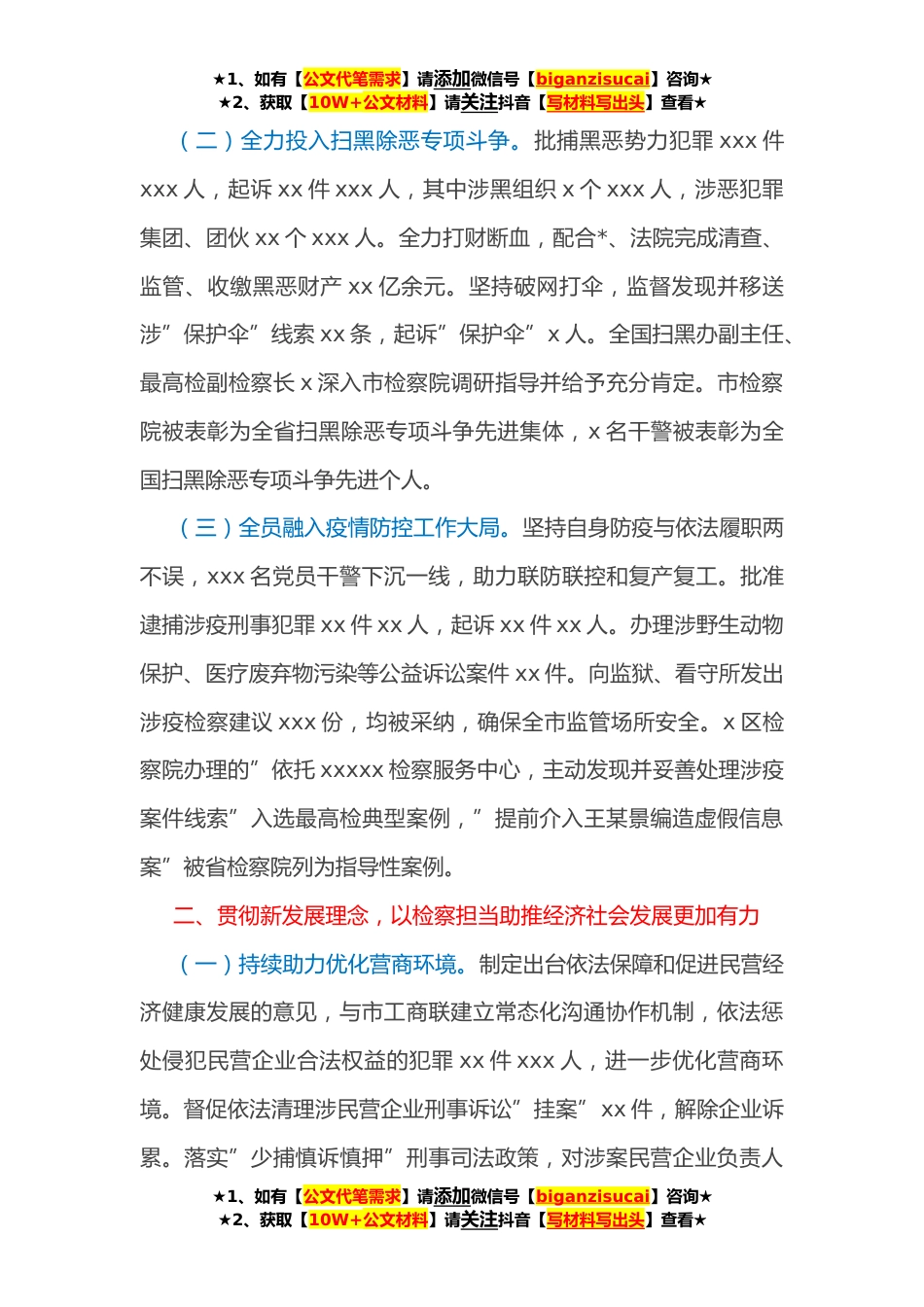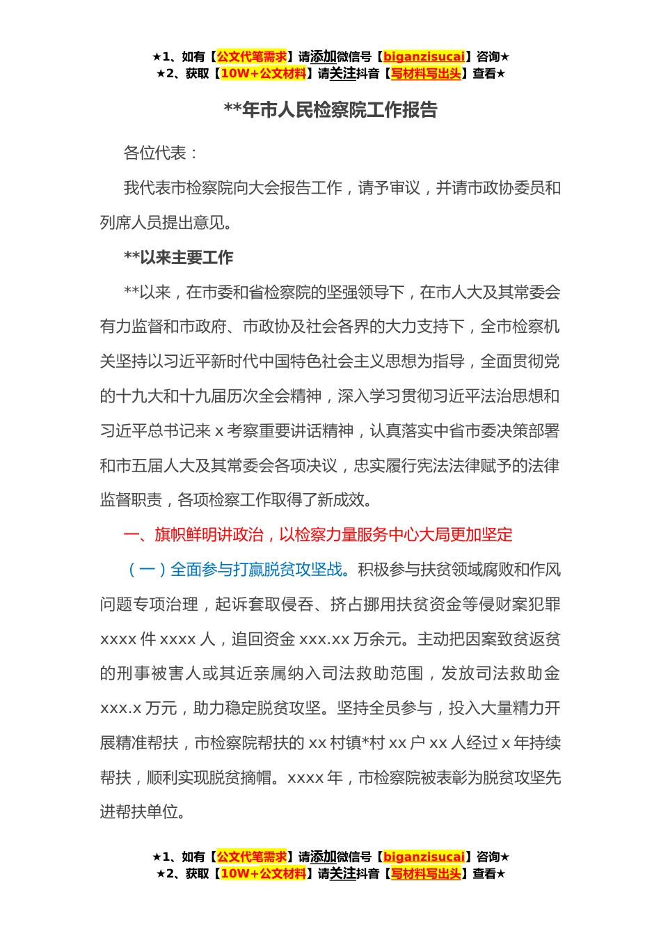 ★1、如有【公文代笔需求】请添加微信号【biganzisucai】咨询★★2、获取【10W+公文材料】请关注抖音【写材料写出头】查看★**年市人民检察院工作报告各位代表:我代表市检察院向大会报告工作,请予审议,并请市政协委员和列席人员提出意见。**以来主要工作**以来,在市委和省检察院的坚强领导下,在市人大及其常委会有力监督和市政府、市政协及社会各界的大力支持下,全市检察机关坚持以习近平新时代中国特色社会主义思想为指导,全面贯彻党的十九大和十九届历次全会精神,深入学习贯彻习近平法治思想和习近平总书记来x考察重要讲话精神,认真落实中省市委决策部署和市五届人大及其常委会各项决议,忠实履行宪法法律赋予的法律监督职责,各项检察工作取得了新成效。一、旗帜鲜明讲政治,以检察力量服务中心大局更...
