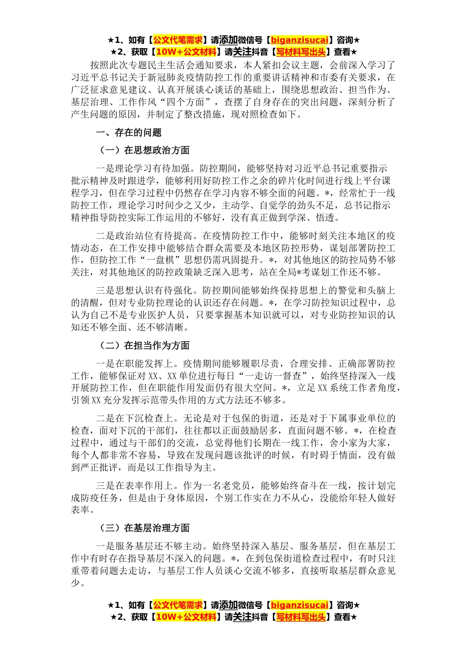 ★1、如有【公文代笔需求】请添加微信号【biganzisucai】咨询★★2、获取【10W+公文材料】请关注抖音【写材料写出头】查看★按照此次专题民主生活会通知要求,本人紧扣会议主题,会前深入学习了习近平总书记关于新冠肺炎疫情防控工作的重要讲话精神和市委有关要求,在广泛征求意见建议、认真开展谈心谈话的基础上,围绕思想政治、担当作为、基层治理、工作作风“四个方面”,查摆了自身存在的突出问题,深刻分析了产生问题的原因,并制定了整改措施,现对照检查如下。一、存在的问题(一)在思想政治方面一是理论学习有待加强。防控期间,能够坚持对习近平总书记重要指示批示精神及时跟进学,能够利用好防控工作之余的碎片化时间进行线上平台课程学习,但在学习过程中仍然存在学习内容不够全面的问题。*,经常忙于...