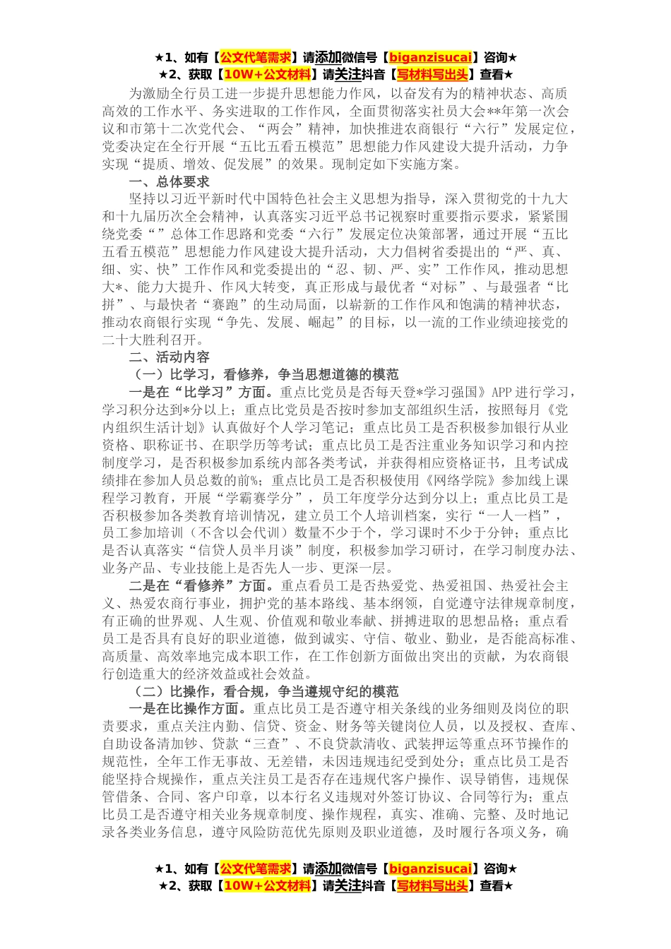 ★1、如有【公文代笔需求】请添加微信号【biganzisucai】咨询★★2、获取【10W+公文材料】请关注抖音【写材料写出头】查看★为激励全行员工进一步提升思想能力作风,以奋发有为的精神状态、高质高效的工作水平、务实进取的工作作风,全面贯彻落实社员大会**年第一次会议和市第十二次党代会、“两会”精神,加快推进农商银行“六行”发展定位,党委决定在全行开展“五比五看五模范”思想能力作风建设大提升活动,力争实现“提质、增效、促发展”的效果。现制定如下实施方案。一、总体要求坚持以习近平新时代中国特色社会主义思想为指导,深入贯彻党的十九大和十九届历次全会精神,认真落实习近平总书记视察时重要指示要求,紧紧围绕党委“”总体工作思路和党委“六行”发展定位决策部署,通过开展“五比五看五模范...