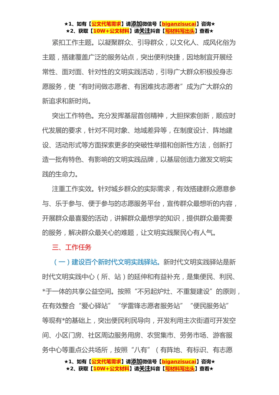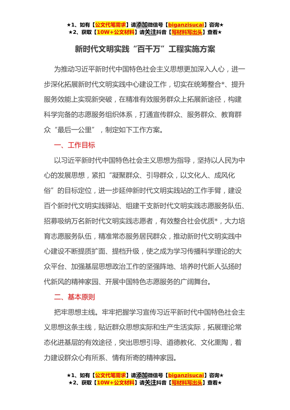 ★1、如有【公文代笔需求】请添加微信号【biganzisucai】咨询★★2、获取【10W+公文材料】请关注抖音【写材料写出头】查看★新时代文明实践“百千万”工程实施方案为推动习近平新时代中国特色社会主义思想更加深入人心,进一步深化拓展新时代文明实践中心建设工作,切实在统筹整合*、提升服务效能上实现新突破,在精准有效服务群众上拓展新途径,构建科学完备的志愿服务组织体系,打通宣传群众、服务群众、教育群众“最后一公里”,制定如下工作方案。一、工作目标以习近平新时代中国特色社会主义思想为指导,坚持以人民为中心的发展思想,紧扣“凝聚群众、引导群众,以文化人、成风化俗”的目标定位,进一步延伸新时代文明实践站的工作手臂,建设百个新时代文明实践驿站、组建千支新时代文明实践志愿服务队伍、招...