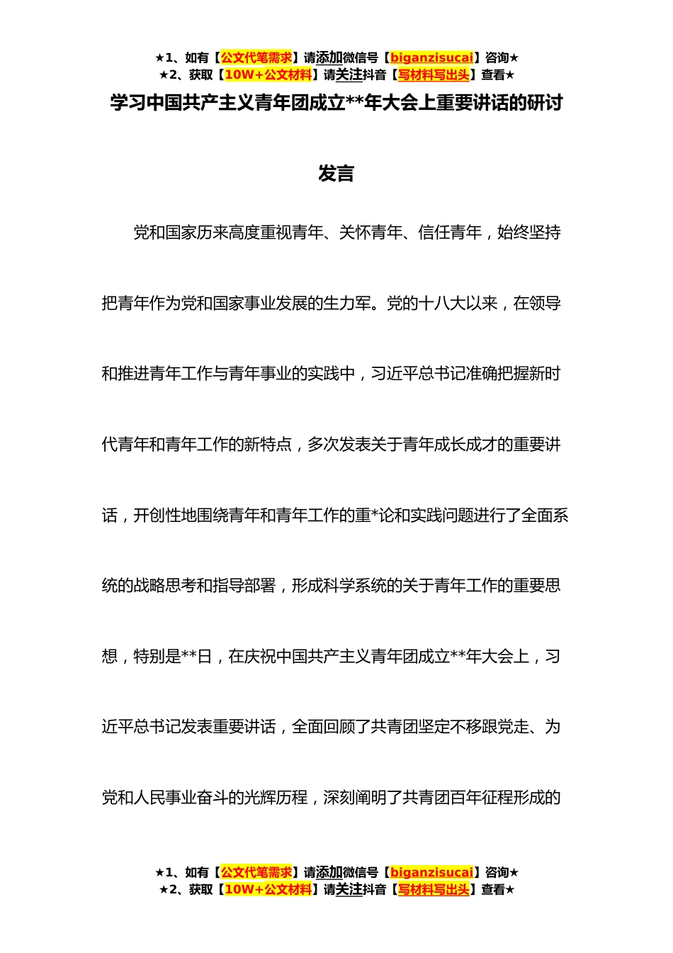 ★1、如有【公文代笔需求】请添加微信号【biganzisucai】咨询★★2、获取【10W+公文材料】请关注抖音【写材料写出头】查看★学习中国共产主义青年团成立**年大会上重要讲话的研讨发言党和国家历来高度重视青年、关怀青年、信任青年,始终坚持把青年作为党和国家事业发展的生力军。党的十八大以来,在领导和推进青年工作与青年事业的实践中,习近平总书记准确把握新时代青年和青年工作的新特点,多次发表关于青年成长成才的重要讲话,开创性地围绕青年和青年工作的重*论和实践问题进行了全面系统的战略思考和指导部署,形成科学系统的关于青年工作的重要思想,特别是**日,在庆祝中国共产主义青年团成立**年大会上,习近平总书记发表重要讲话,全面回顾了共青团坚定不移跟党走、为党和人民事业奋斗的光辉历程,深刻...