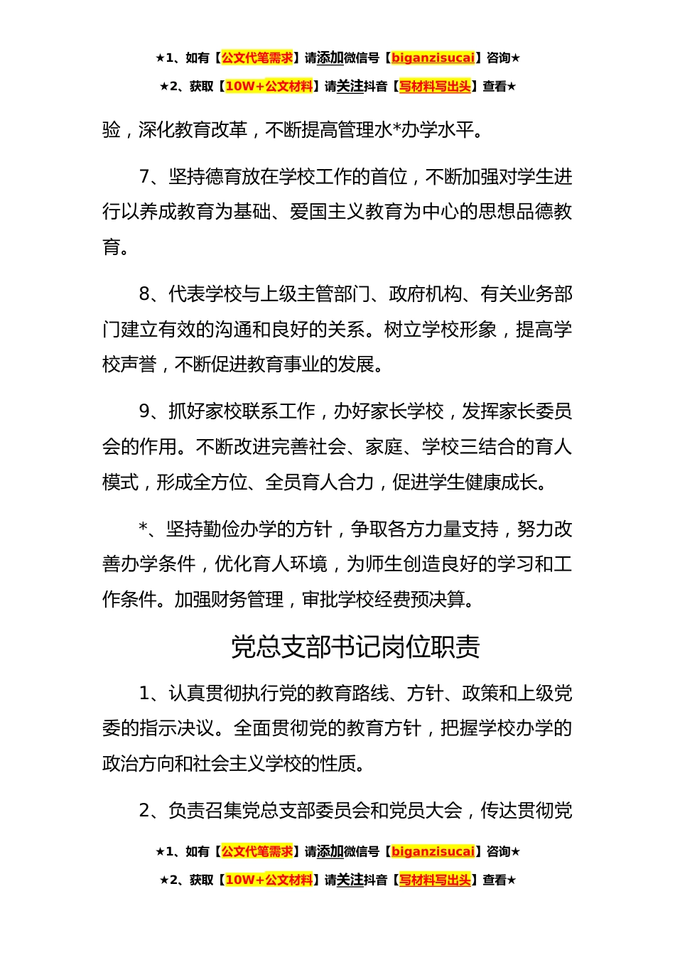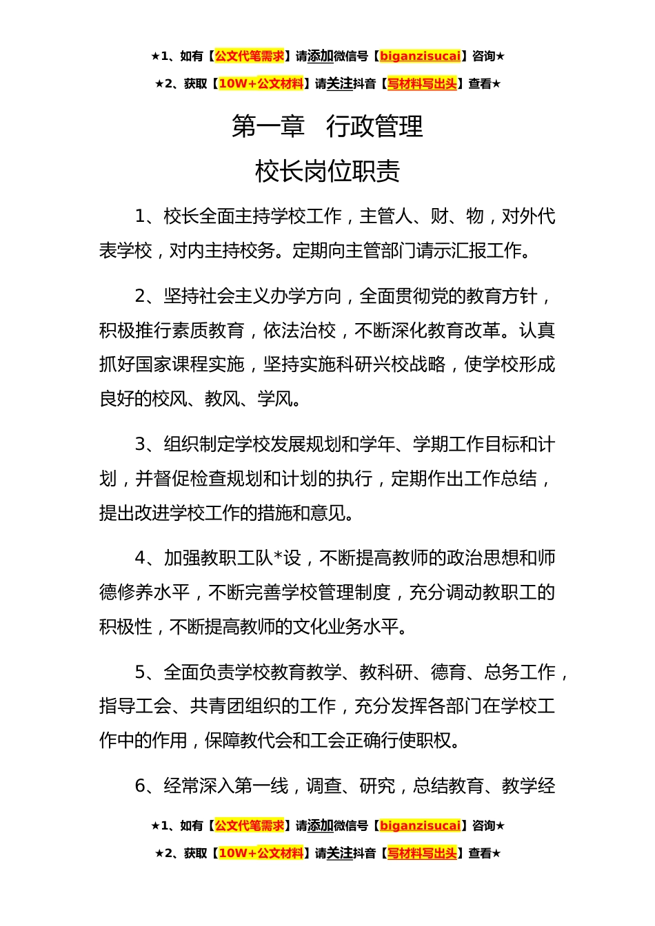 ★1、如有【公文代笔需求】请添加微信号【biganzisucai】咨询★★2、获取【10W+公文材料】请关注抖音【写材料写出头】查看★第一章行政管理校长岗位职责1、校长全面主持学校工作,主管人、财、物,对外代表学校,对内主持校务。定期向主管部门请示汇报工作。2、坚持社会主义办学方向,全面贯彻党的教育方针,积极推行素质教育,依法治校,不断深化教育改革。认真抓好国家课程实施,坚持实施科研兴校战略,使学校形成良好的校风、教风、学风。3、组织制定学校发展规划和学年、学期工作目标和计划,并督促检查规划和计划的执行,定期作出工作总结,提出改进学校工作的措施和意见。4、加强教职工队*设,不断提高教师的政治思想和师德修养水平,不断完善学校管理制度,充分调动教职工的积极性,不断提高教师的文化业务...