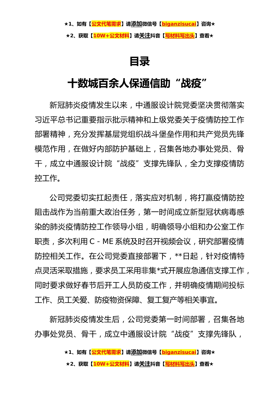 ★1、如有【公文代笔需求】请添加微信号【biganzisucai】咨询★★2、获取【10W+公文材料】请关注抖音【写材料写出头】查看★目录十数城百余人保通信助“战疫”新冠肺炎疫情发生以来,中通服设计院党委坚决贯彻落实习近平总书记重要指示批示精神和上级党委关于疫情防控工作部署精神,充分发挥基层党组织战斗堡垒作用和共产党员先锋模范作用,在做好内部防护基础上,召集各地办事处党员、骨干,成立中通服设计院“战疫”支撑先锋队,全力支撑疫情防控工作。公司党委切实扛起责任,落实应对机制,将打赢疫情防控阻击战作为当前重大政治任务,第一时间成立新型冠状病毒感染的肺炎疫情防控工作领导小组,明确领导小组和办公室工作职责,多次利用C-ME系统及时召开视频会议,研究部署疫情防控相关工作。在公司党委直接部...