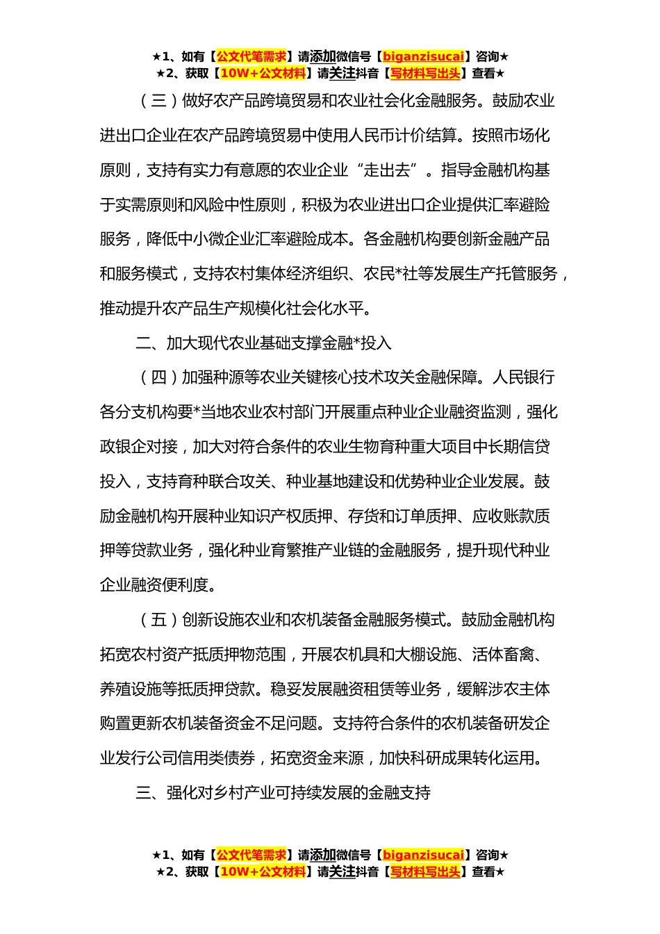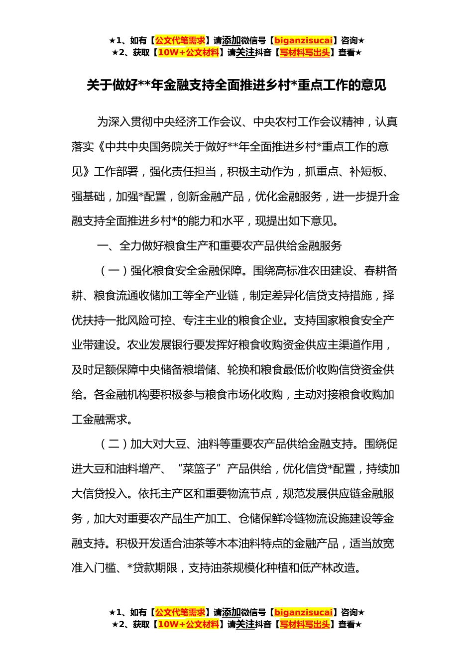 ★1、如有【公文代笔需求】请添加微信号【biganzisucai】咨询★★2、获取【10W+公文材料】请关注抖音【写材料写出头】查看★关于做好**年金融支持全面推进乡村*重点工作的意见为深入贯彻中央经济工作会议、中央农村工作会议精神,认真落实《中共中央国务院关于做好**年全面推进乡村*重点工作的意见》工作部署,强化责任担当,积极主动作为,抓重点、补短板、强基础,加强*配置,创新金融产品,优化金融服务,进一步提升金融支持全面推进乡村*的能力和水平,现提出如下意见。一、全力做好粮食生产和重要农产品供给金融服务(一)强化粮食安全金融保障。围绕高标准农田建设、春耕备耕、粮食流通收储加工等全产业链,制定差异化信贷支持措施,择优扶持一批风险可控、专注主业的粮食企业。支持国家粮食安全产业带建设...