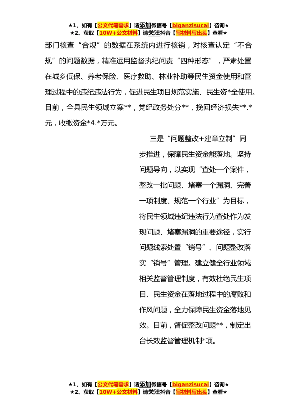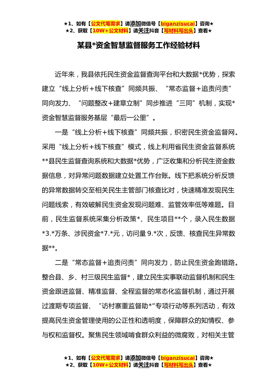 ★1、如有【公文代笔需求】请添加微信号【biganzisucai】咨询★★2、获取【10W+公文材料】请关注抖音【写材料写出头】查看★某县*资金智慧监督服务工作经验材料近年来,我县依托民生资金监督查询平台和大数据*优势,探索建立“线上分析+线下核查”同频共振、“常态监督+追责问责”同向发力、“问题整改+建章立制”同步推进“三同”机制,实现*资金智慧监督服务基层“最后一公里”。一是“线上分析+线下核查”同频共振,织密民生资金监督网。采用“线上分析+线下核查”模式,线上利用省民生资金监督系统**县民生监督查询系统和大数据*优势,广泛收集和分析民生资金数据信息,对异常问题数据建立处置工作台账。线下把系统分析反馈的异常数据转交至相关民生主管部门核查比对,快速精准发现民生问题线索,有效破解民生...