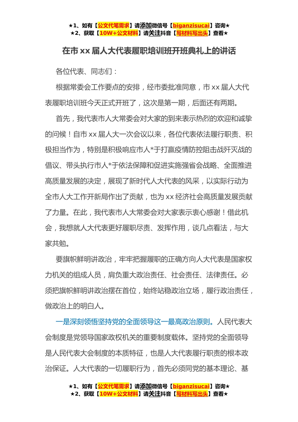 ★1、如有【公文代笔需求】请添加微信号【biganzisucai】咨询★★2、获取【10W+公文材料】请关注抖音【写材料写出头】查看★在市xx届人大代表履职培训班开班典礼上的讲话各位代表、同志们:根据常委会工作要点的安排,经市委批准同意,市xx届人大代表履职培训班今天正式开班了,这次是第一期,后面还有两期。首先,我代表市人大常委会对大家的到来表示热烈的欢迎和诚挚的问候!自市xx届人大一次会议以来,各位代表依法履行职责、积极担当作为,特别是积极响应市人*于打赢疫情防控阻击战歼灭战的倡议、带头执行市人*于依法保障和促进实施强省会战略、全面推进高质量发展的决定,展现了新时代人大代表的风采,以实际行动为全市人大工作开新局作出了贡献,也为xx经济社会高质量发展贡献了力量。在此,我代表市人大常...