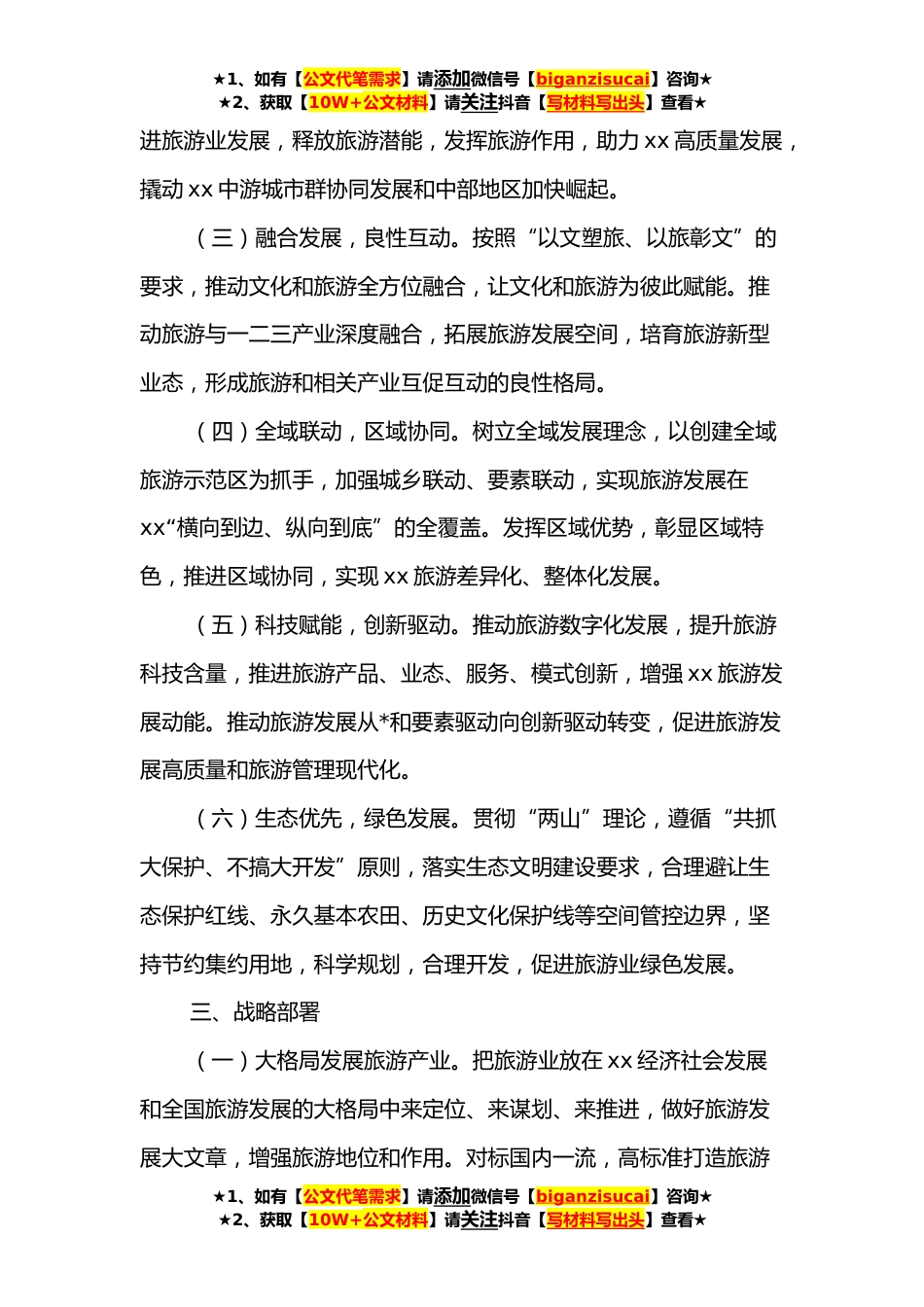 ★1、如有【公文代笔需求】请添加微信号【biganzisucai】咨询★★2、获取【10W+公文材料】请关注抖音【写材料写出头】查看★XXX促进旅游业发展工作方案一、指导思想以习近平新时代中国特色社会主义思想为指导,立足新发展阶段,完整准确全面贯彻新发展理念,服务和融入新发展格局,紧紧围绕“推动xxx高质量发展、加快建成中部地区崛起重要战略支点”的总体要求,落实xx“一主引领、两翼驱动、全域协同”区域发展布局,坚持稳中求进工作总基调,按照全国旅游发展第一方阵的目标定位,适应文旅融合新形势,以全域旅游为方向,以推动旅游高质量发展为主题,以深化旅游供给侧结构性改革为主线,以提供优质旅游产品和服务为中心环节,加强改革创新,统筹发展和安全,努力叫响“世界知名旅游目的地”,叫响“万亿元产业...