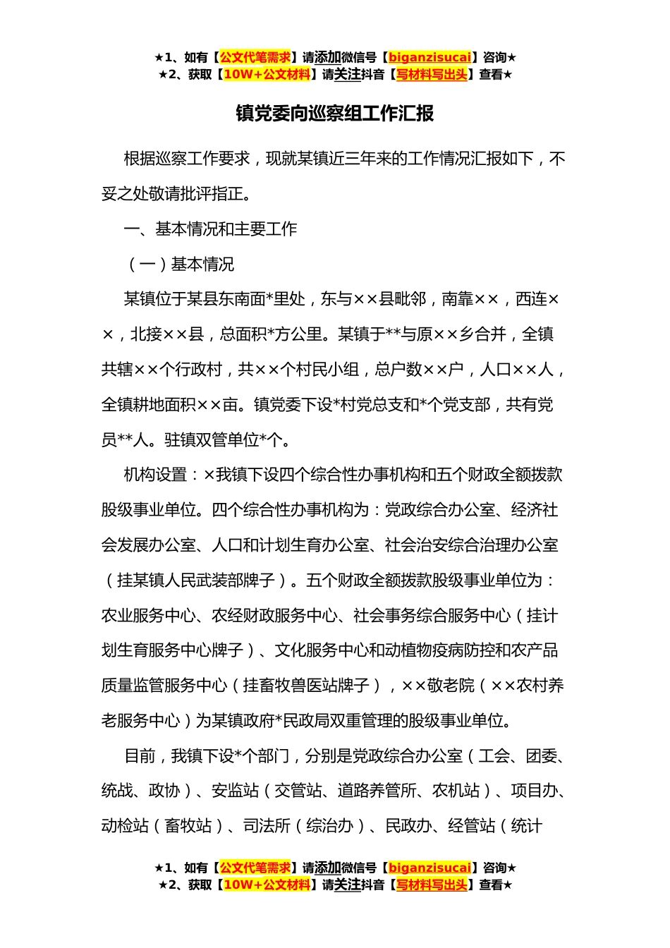 ★1、如有【公文代笔需求】请添加微信号【biganzisucai】咨询★★2、获取【10W+公文材料】请关注抖音【写材料写出头】查看★镇党委向巡察组工作汇报根据巡察工作要求,现就某镇近三年来的工作情况汇报如下,不妥之处敬请批评指正。一、基本情况和主要工作(一)基本情况某镇位于某县东南面*里处,东与××县毗邻,南靠××,西连××,北接××县,总面积*方公里。某镇于**与原××乡合并,全镇共辖××个行政村,共××个村民小组,总户数××户,人口××人,全镇耕地面积××亩。镇党委下设*村党总支和*个党支部,共有党员**人。驻镇双管单位*个。机构设置:×我镇下设四个综合性办事机构和五个财政全额拨款股级事业单位。四个综合性办事机构为:党政综合办公室、经济社会发展办公室、人口和计划生育办公室、社...