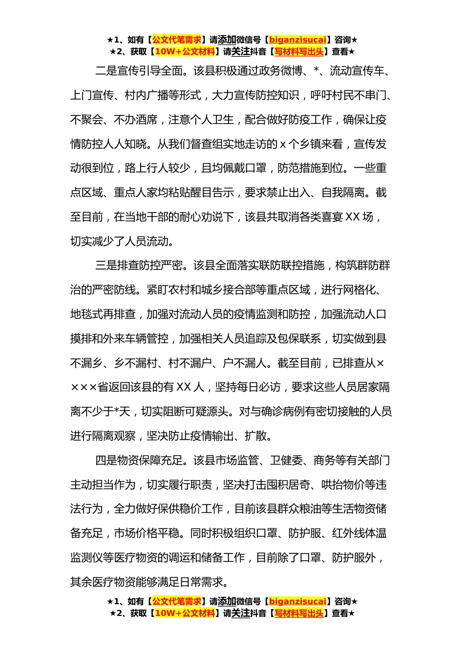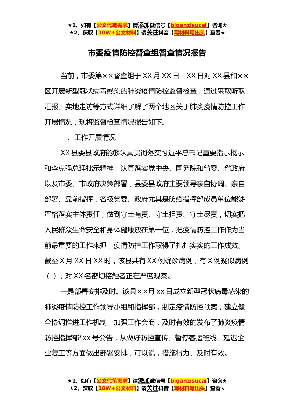 ★1、如有【公文代笔需求】请添加微信号【biganzisucai】咨询★★2、获取【10W+公文材料】请关注抖音【写材料写出头】查看★市委疫情防控督查组督查情况报告当前,市委第××督查组于XX月XX日-XX日对XX县和××区开展新型冠状病毒感染的肺炎疫情防控监督检查,通过采取听取汇报、实地走访等方式详细了解了两个地区关于肺炎疫情防控工作开展情况,现将监督检查情况报告如下。一、工作开展情况XX县委县政府能够认真贯彻落实习近平总书记重要指示批示和李克强总理批示精神,认真落实党中央、国务院和省委、省政府以及市委、市政府决策部署,县委县政府主要领导亲自协调、亲自部署、靠前指挥,各级党委、政府尤其是防疫指挥部成员单位能够严格落实主体责任,做到守土有责、守土担责、守土尽责,切实把人民群众生命安...
