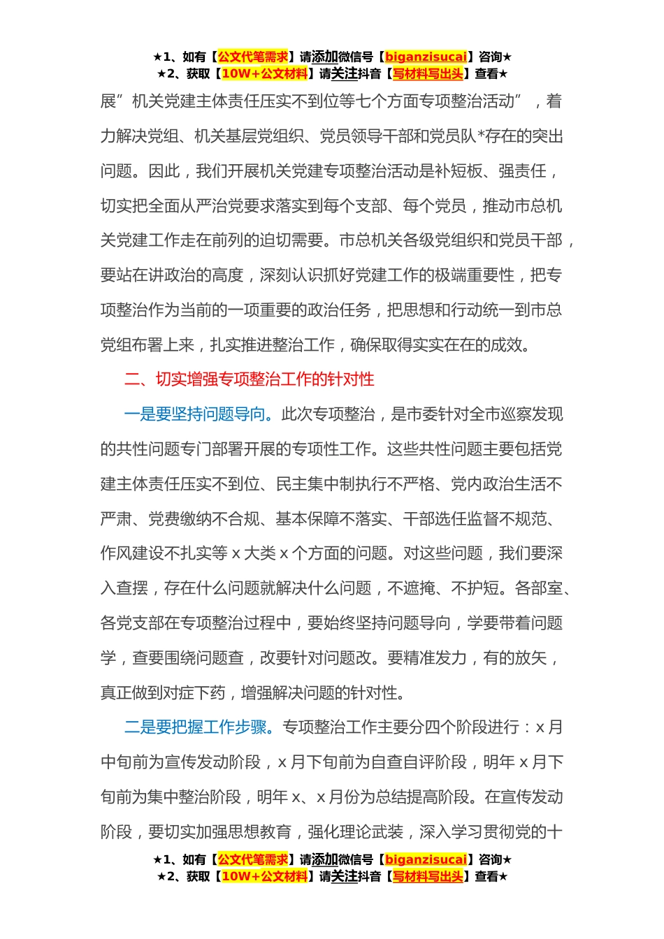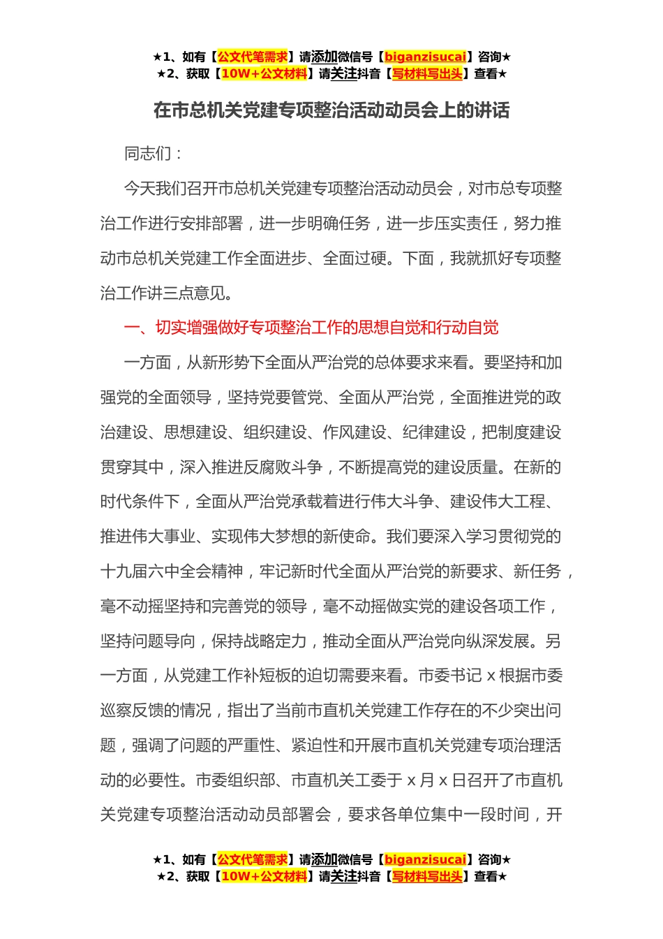 ★1、如有【公文代笔需求】请添加微信号【biganzisucai】咨询★★2、获取【10W+公文材料】请关注抖音【写材料写出头】查看★在市总机关党建专项整治活动动员会上的讲话同志们:今天我们召开市总机关党建专项整治活动动员会,对市总专项整治工作进行安排部署,进一步明确任务,进一步压实责任,努力推动市总机关党建工作全面进步、全面过硬。下面,我就抓好专项整治工作讲三点意见。一、切实增强做好专项整治工作的思想自觉和行动自觉一方面,从新形势下全面从严治党的总体要求来看。要坚持和加强党的全面领导,坚持党要管党、全面从严治党,全面推进党的政治建设、思想建设、组织建设、作风建设、纪律建设,把制度建设贯穿其中,深入推进反腐败斗争,不断提高党的建设质量。在新的时代条件下,全面从严治党承载着...