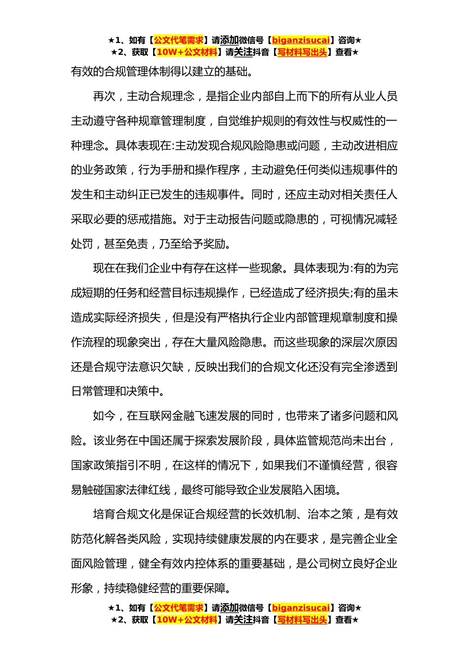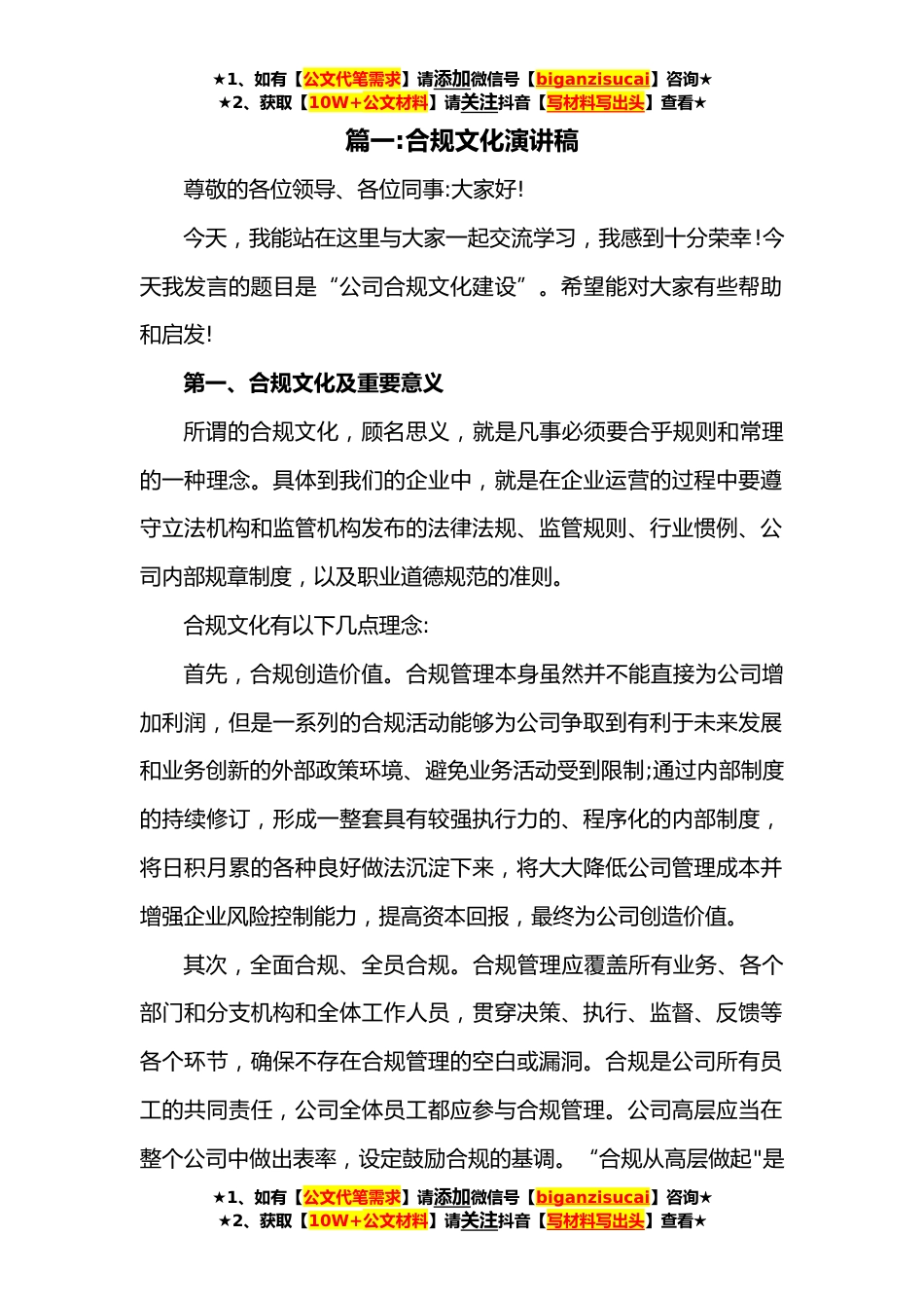 ★1、如有【公文代笔需求】请添加微信号【biganzisucai】咨询★★2、获取【10W+公文材料】请关注抖音【写材料写出头】查看★篇一:合规文化演讲稿尊敬的各位领导、各位同事:大家好!今天,我能站在这里与大家一起交流学习,我感到十分荣幸!今天我发言的题目是“公司合规文化建设”。希望能对大家有些帮助和启发!第一、合规文化及重要意义所谓的合规文化,顾名思义,就是凡事必须要合乎规则和常理的一种理念。具体到我们的企业中,就是在企业运营的过程中要遵守立法机构和监管机构发布的法律法规、监管规则、行业惯例、公司内部规章制度,以及职业道德规范的准则。合规文化有以下几点理念:首先,合规创造价值。合规管理本身虽然并不能直接为公司增加利润,但是一系列的合规活动能够为公司争取到有利于未来发展和业务...