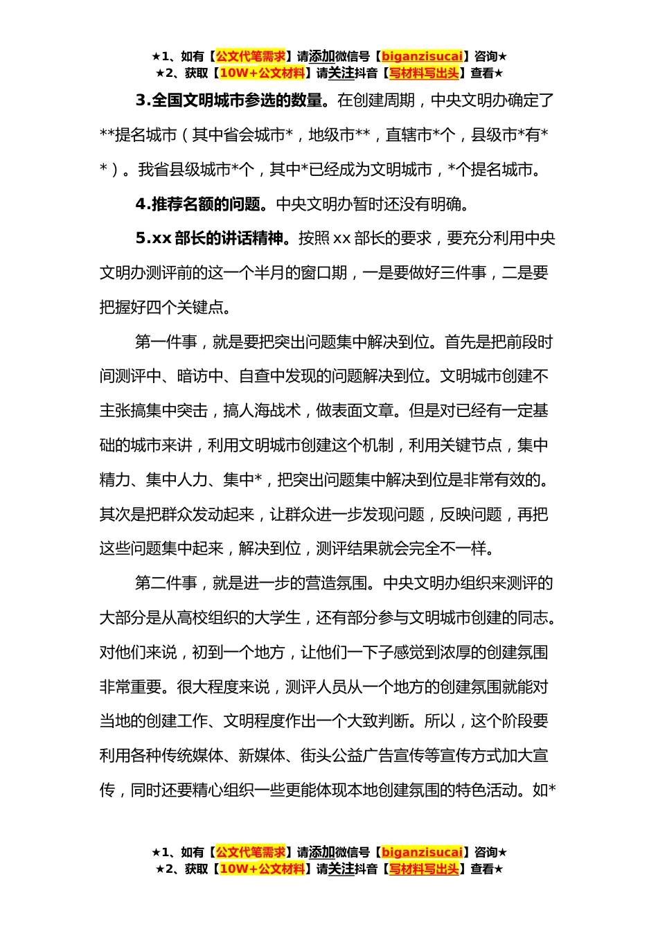 ★1、如有【公文代笔需求】请添加微信号【biganzisucai】咨询★★2、获取【10W+公文材料】请关注抖音【写材料写出头】查看★创建全国文明城市工作汇报提纲一、全省文明城市创建工作推进会会议精神**日下午,省文明委召开全省文明城市创建工作推进会暨争创全国文明城市培训班。会议分两个阶段进行,第一个阶段有三项议程。一是省委宣传部常务副部长xx宣读了中央文明办*xx年测评成绩及相关问题通报;二是观看了*、*、*、*、**城市创建工作经验视频、专题片;播放了省文明办对*个全国提名城市暗访发现的部分问题短片;三是省委常委、宣传部长xx做了重要讲话。第二个阶段就文明城市测评工作的重点问题进行了培训。会上明确了几项主要工作:1.今年的测评时间。(一)按照中央文明办的安排,今年*份左右,对在届全国文明...