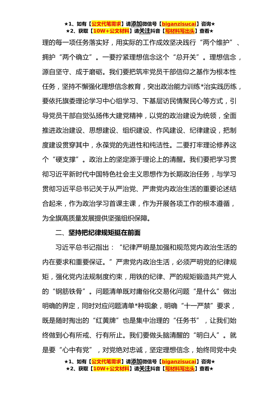 ★1、如有【公文代笔需求】请添加微信号【biganzisucai】咨询★★2、获取【10W+公文材料】请关注抖音【写材料写出头】查看★集中治理全区党内政治生活庸俗化交易化问题研讨发言材料习近平总书记曾指出,党要管党,首先要从党内政治生活管起;从严治党,首先要从党内政治生活严起。开展党内政治生活庸俗化交易化问题集中治理,是贯彻落实习近平总书记在参加十三届全国人大五次会议*代表团审议时的重要讲话精神的具体行动,是深入推进全面从严治党的现实需要,是激励干部担当作为、狠抓落实的重要契机。按照旗委理论学习中心组学习安排,我认真学习了《关于集中治理全区党内政治生活庸俗化交易化问题的实施方案》《中国共产党章程》《关于新形势下党内政治生活的若干准则》及习近平总书记关于加强党内政治生活重要论...