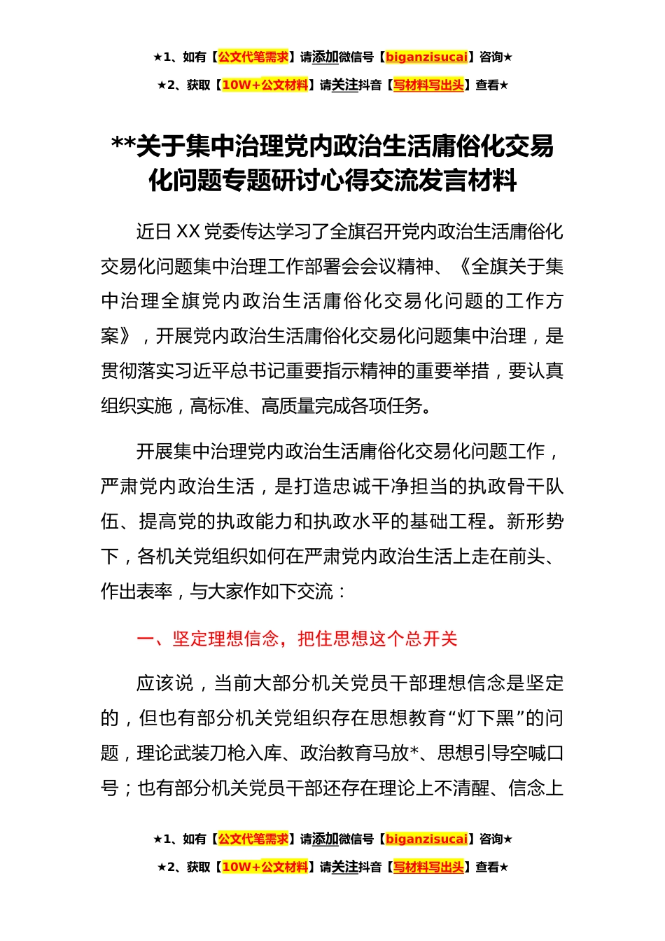 ★1、如有【公文代笔需求】请添加微信号【biganzisucai】咨询★★2、获取【10W+公文材料】请关注抖音【写材料写出头】查看★**关于集中治理党内政治生活庸俗化交易化问题专题研讨心得交流发言材料近日XX党委传达学习了全旗召开党内政治生活庸俗化交易化问题集中治理工作部署会会议精神、《全旗关于集中治理全旗党内政治生活庸俗化交易化问题的工作方案》,开展党内政治生活庸俗化交易化问题集中治理,是贯彻落实习近平总书记重要指示精神的重要举措,要认真组织实施,高标准、高质量完成各项任务。开展集中治理党内政治生活庸俗化交易化问题工作,严肃党内政治生活,是打造忠诚干净担当的执政骨干队伍、提高党的执政能力和执政水平的基础工程。新形势下,各机关党组织如何在严肃党内政治生活上走在前头、作出表率...