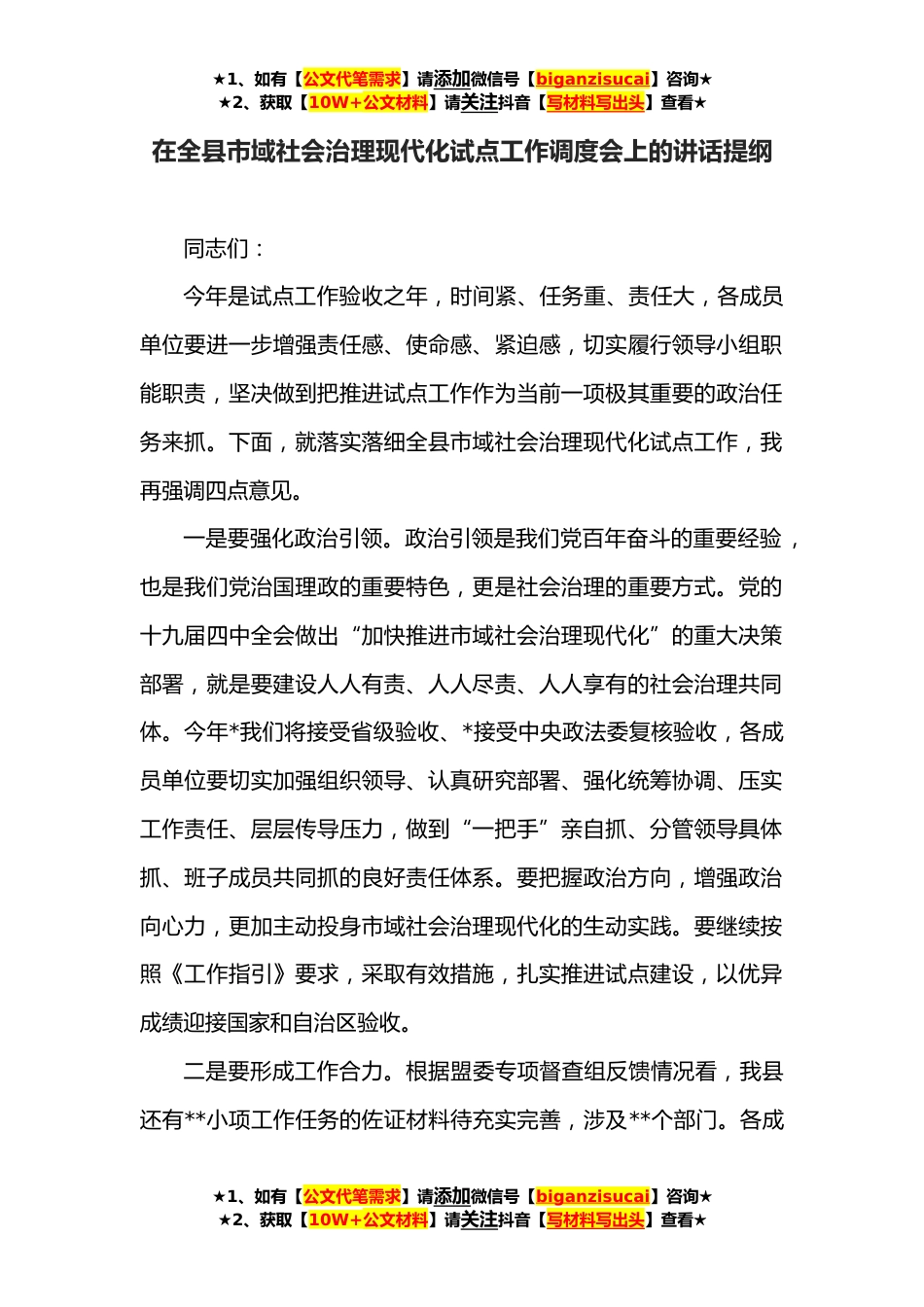 ★1、如有【公文代笔需求】请添加微信号【biganzisucai】咨询★★2、获取【10W+公文材料】请关注抖音【写材料写出头】查看★在全县市域社会治理现代化试点工作调度会上的讲话提纲同志们:今年是试点工作验收之年,时间紧、任务重、责任大,各成员单位要进一步增强责任感、使命感、紧迫感,切实履行领导小组职能职责,坚决做到把推进试点工作作为当前一项极其重要的政治任务来抓。下面,就落实落细全县市域社会治理现代化试点工作,我再强调四点意见。一是要强化政治引领。政治引领是我们党百年奋斗的重要经验,也是我们党治国理政的重要特色,更是社会治理的重要方式。党的十九届四中全会做出“加快推进市域社会治理现代化”的重大决策部署,就是要建设人人有责、人人尽责、人人享有的社会治理共同体。今年*我们将...